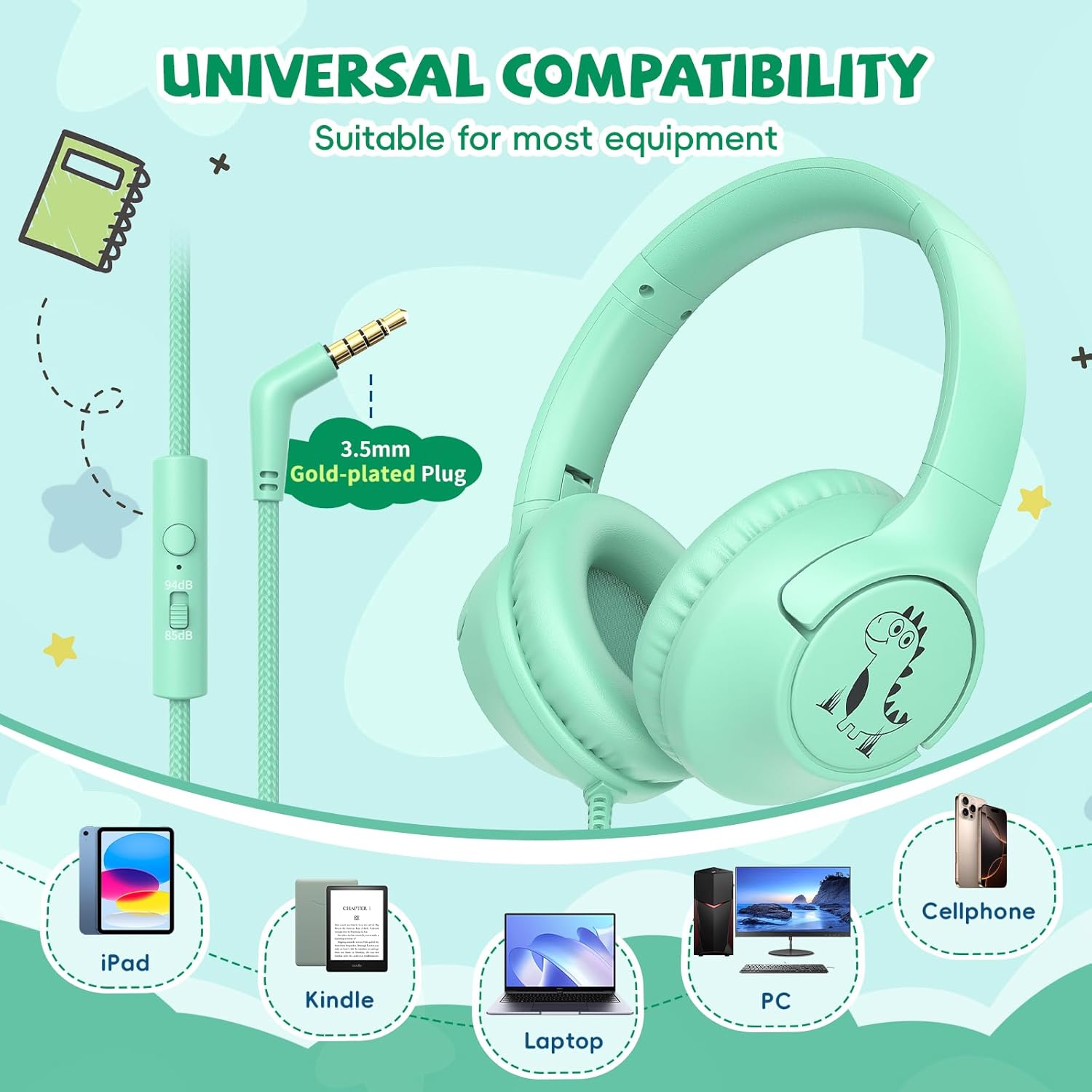 Kids Headphones Wired for School, 85/94dB Volume Limit Toddler Headphones with Microphone, Wired Cute Dinosaur for Boys Girls, Stereo Sound 3.5mm Plug for Kindle Tablet School, Green