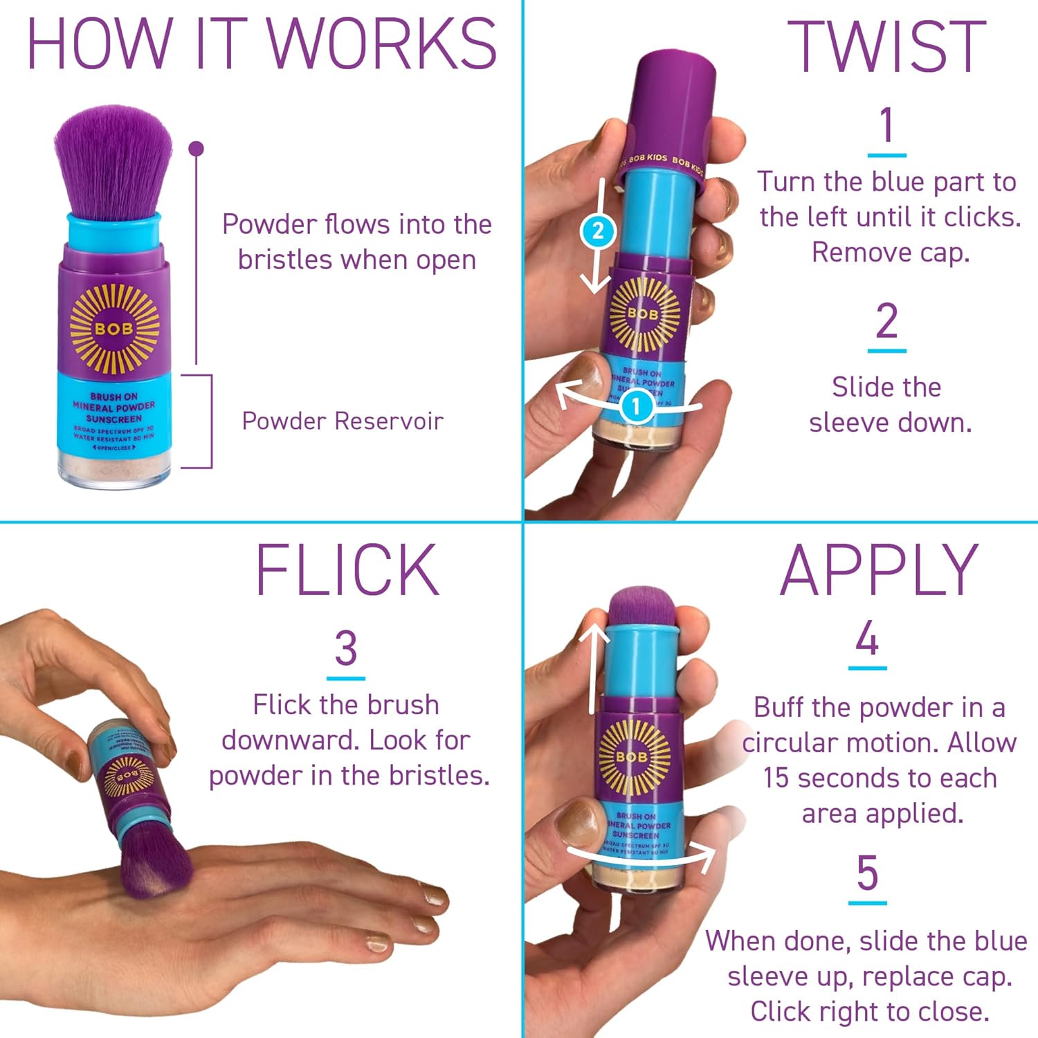 - No Fuss Application: BOB KIDS fluffy purple brush makes applying sunblock easy for both you & your child. To open, twist the bottom of the brush to the left & twist back to close; No mess, no tears