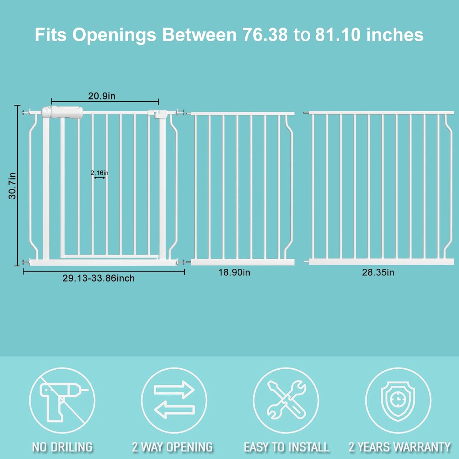 WAOWAO Baby Gate 76.38-81.07" Extra Wide Pressure Mounted Walk Through Swing Auto Close Safety White Metal Toddler Kids Child Dog Pet Puppy for Stairs,Doorways,Kitchen
