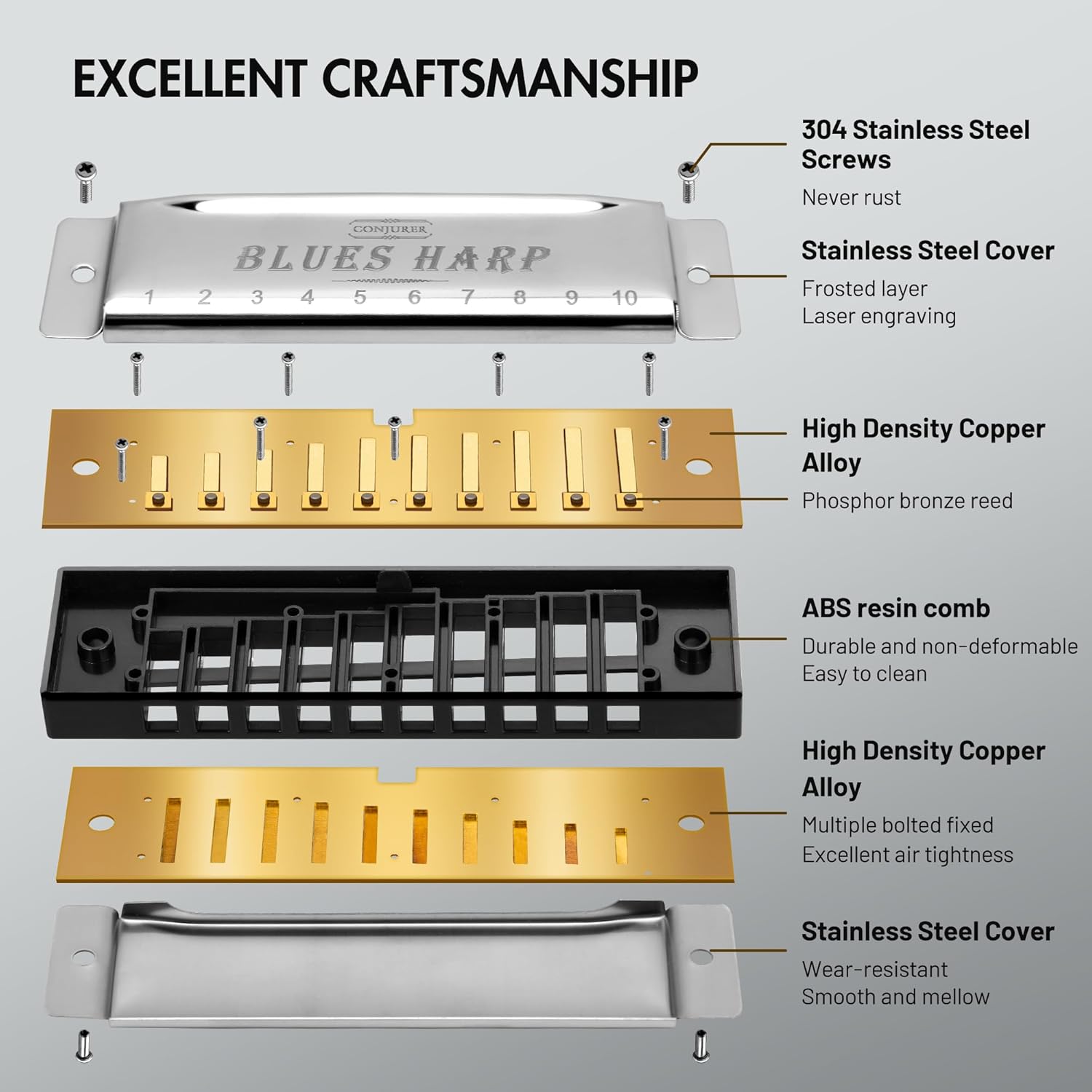 CONJURER Blues Harmonica for Beginners, 10 Hole A Key Diatonic Blues Harp with Stainless Steel Cover & Phosphor Bronze Reeds, Professional Grade for Adults, Gifts (Silver A)