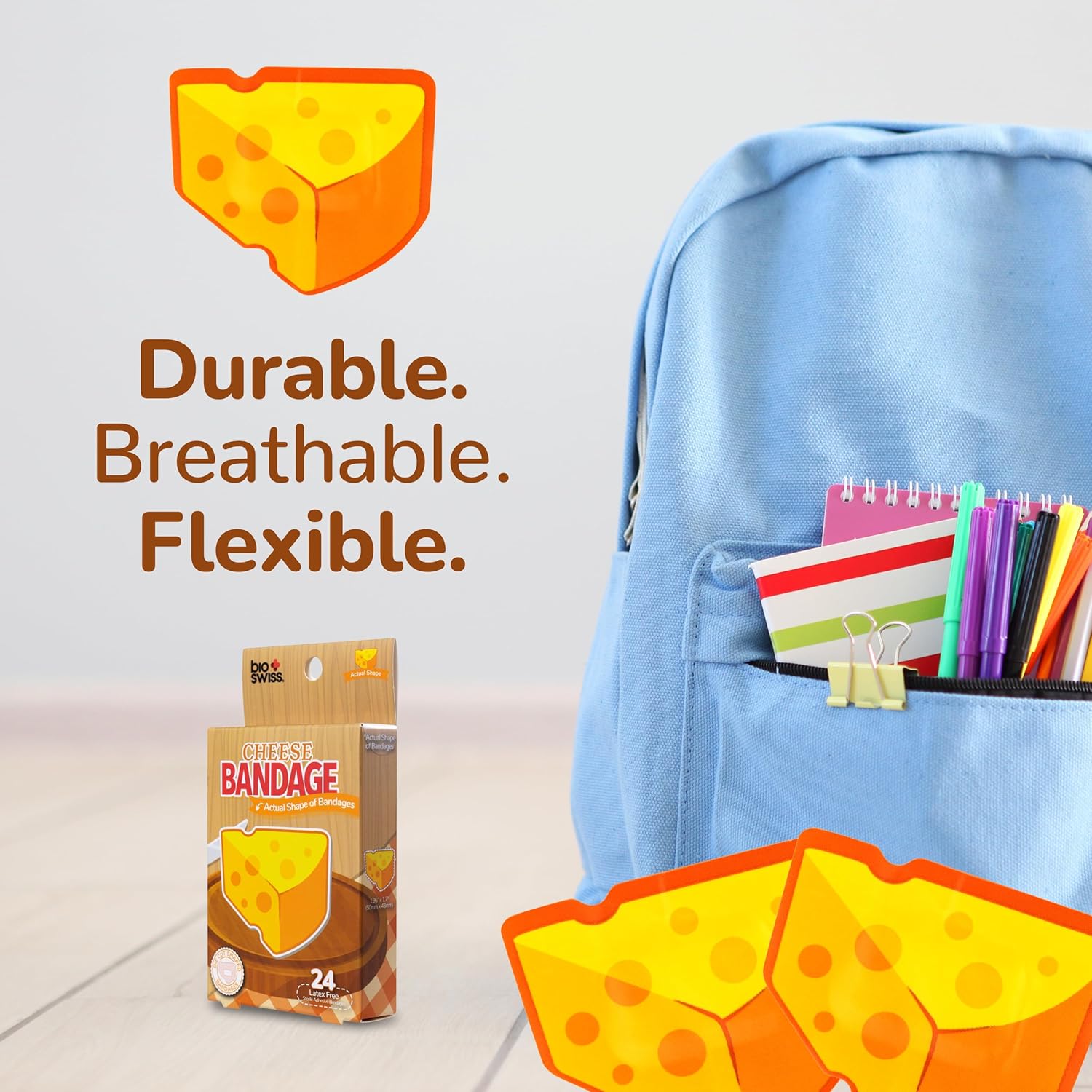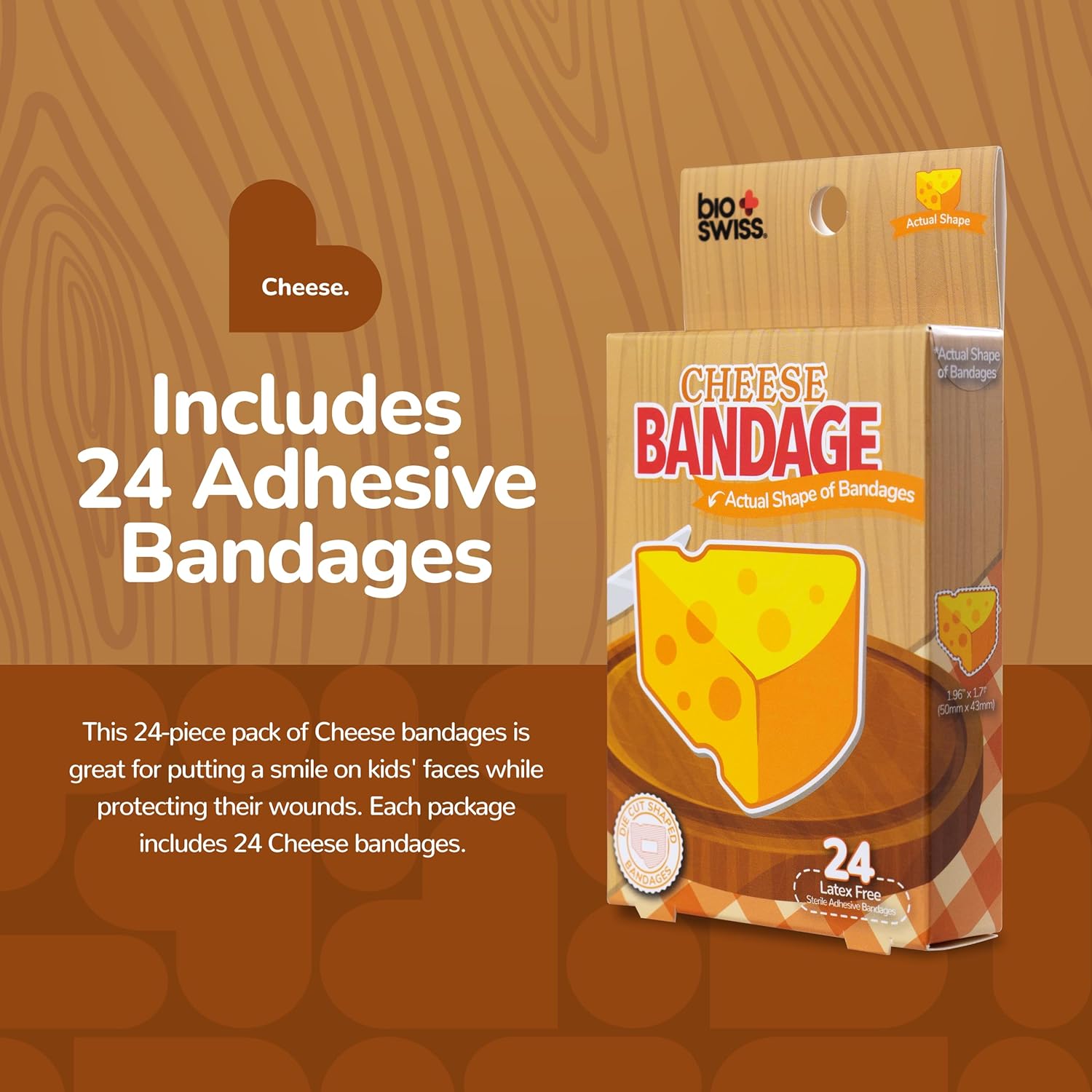 BioSwiss Bandages, Cheese Shaped Self Adhesive Bandage, Latex Free Wound Care, Fun First Aid Kit Supplies for Kids and Adults, 24 Count
