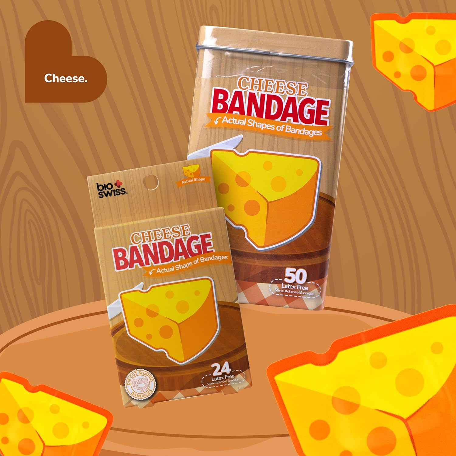 - CHEESE BANDAGES: This 24 piece pack of Cheese shaped bandages is great for putting a smile on kids' faces while protecting wounds such as cuts, scrapes, and burns; sticky bandages come in a cute tin and are perfect for kids and adults alike, and also for school nurses and pediatric doctors
