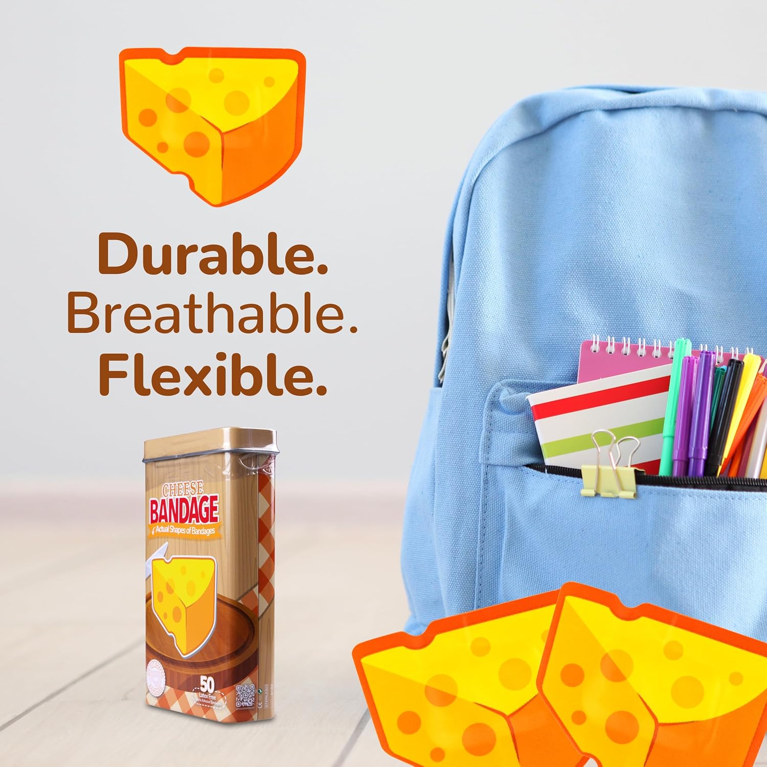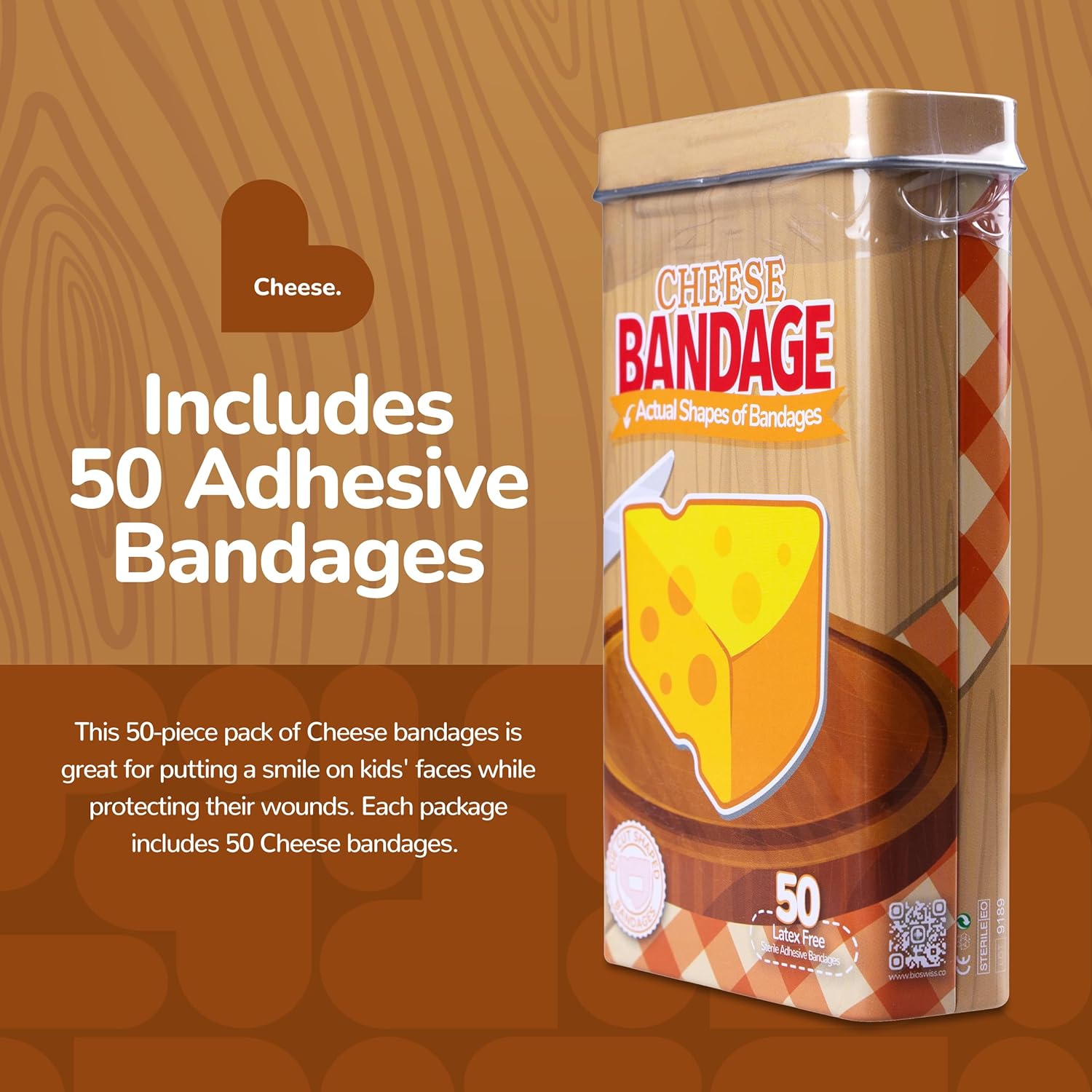 - CHEESE BANDAGES: This 50 piece tin of Cheese shaped bandages is great for putting a smile on kids' faces while protecting wounds such as cuts, scrapes, and burns; sticky bandages come in a cute tin and are perfect for kids and adults alike, and also for school nurses and pediatric doctors