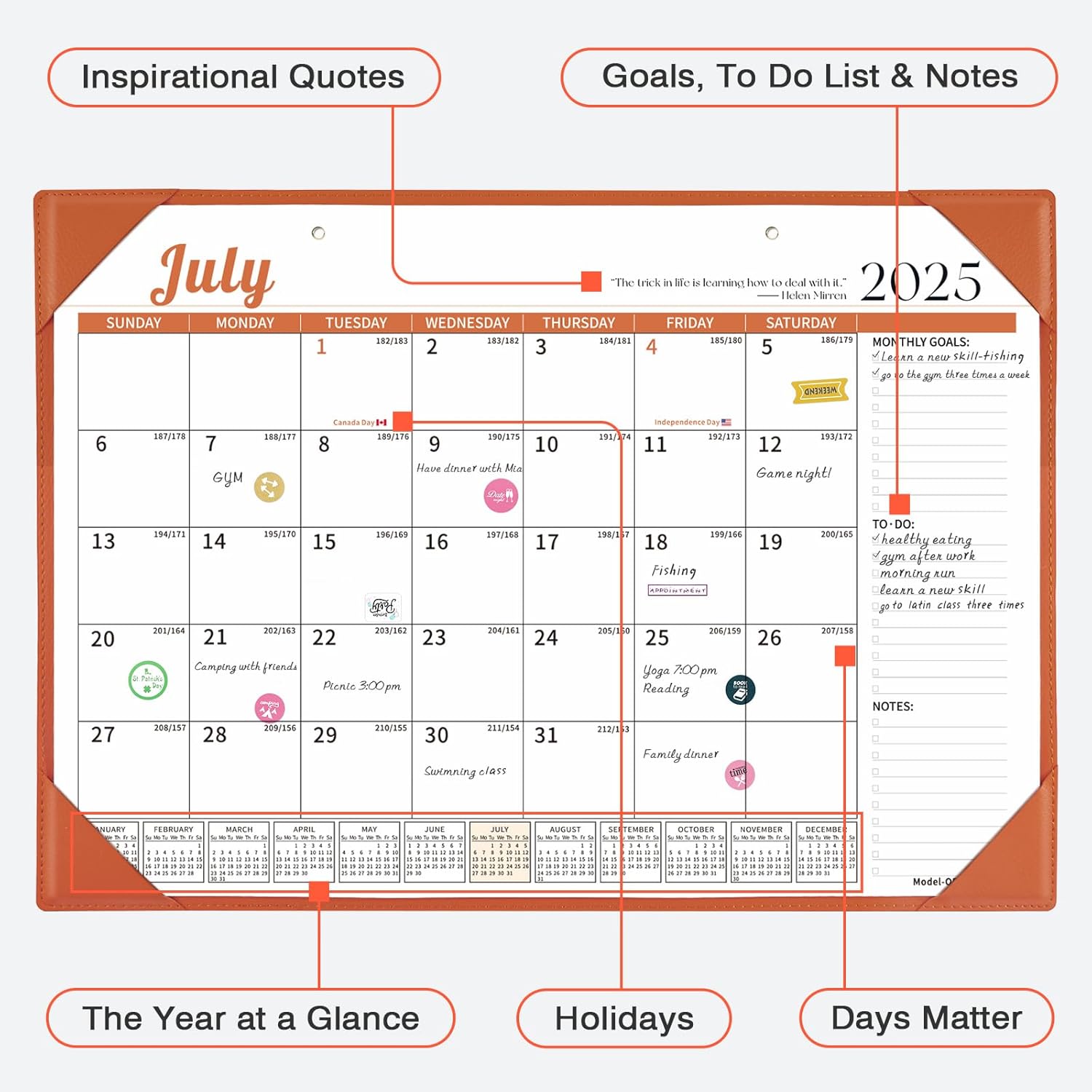 - Two Ways to Use It: The calendar can be placed on the desktop or hung on the wall by using our matching detachable string. Two hanging holes enable it to also be used as a wall calendar. In addition, the matching faux leather pad can be used as a desk mat or mouse pad.