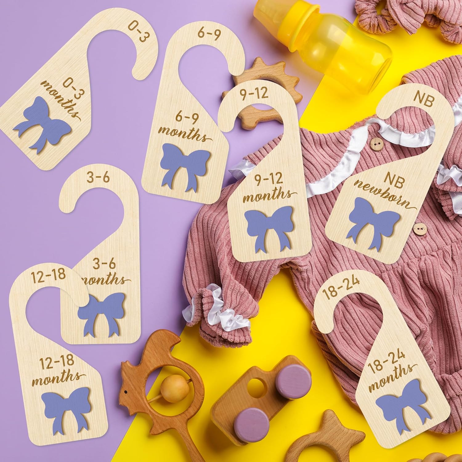 R HORSE Wooden Baby Closet Dividers - 8Pcs Double-Sided 3D Purple Bow Baby Closet Organizer Newborn Clothes Size Hanger Dividers Nursery Decor Baby Shower Birthday Gift for Boy Girl (0-24 Months)