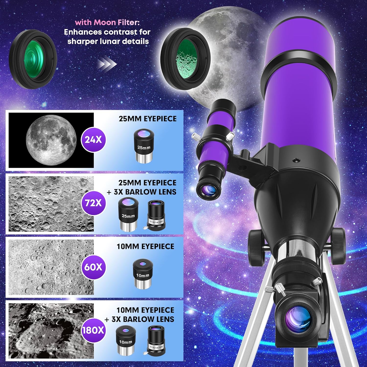 - Optimum Magnification: This telescope for adults, kids, and beginners includes 25mm & 10mm eyepieces and a 3X Barlow lens, offering 24X-180X magnification. A 5X24 finder scope for fast targeting. Perfect for moon, birding, wildlife, scenery & stargazing