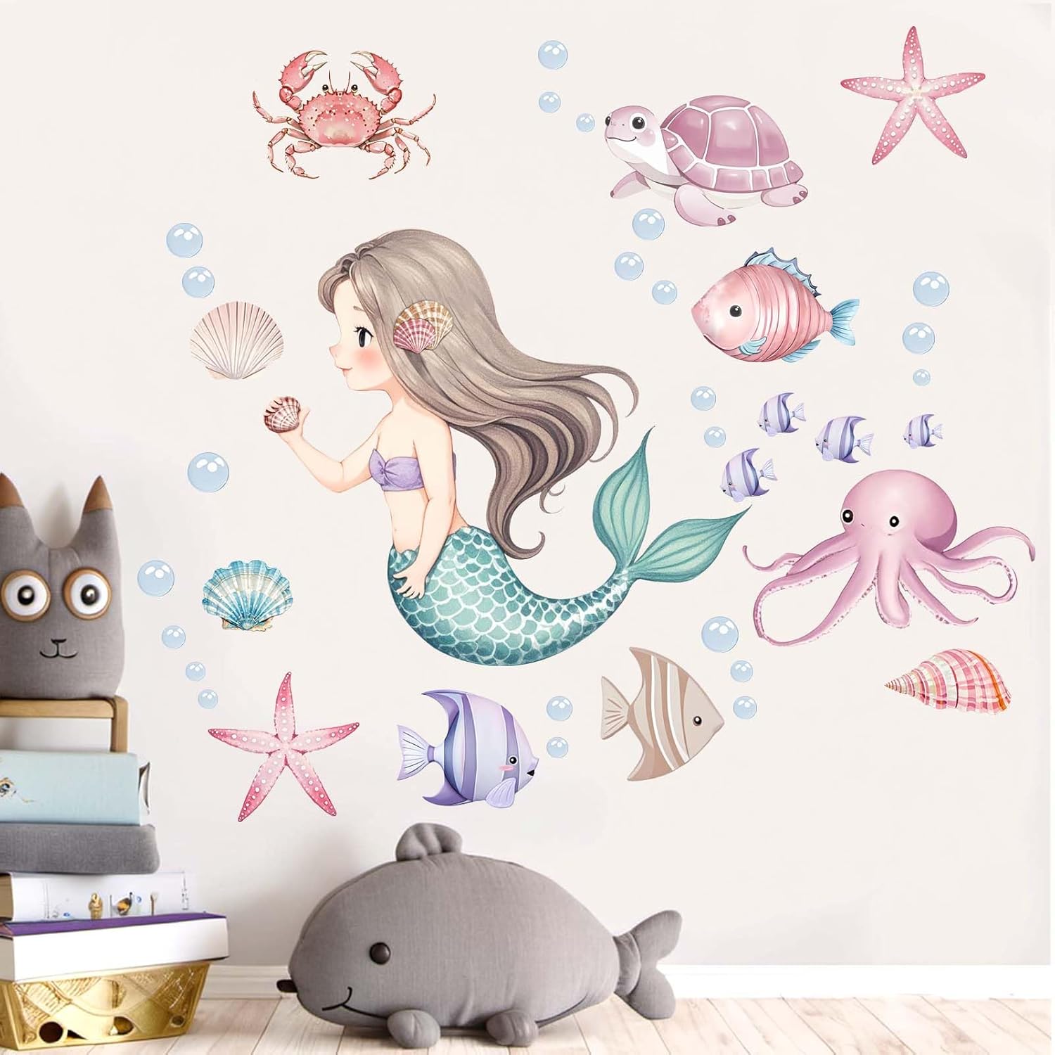 Mermaid Wall Stickers for Girls Bedroom: Peel and Stick Under The Sea Turtle Marine Ocean Fish Starfish Shell Wall Decals - Baby Nursery Girl Room Toddler Room - Kids Supplies Ages 1-12 Year