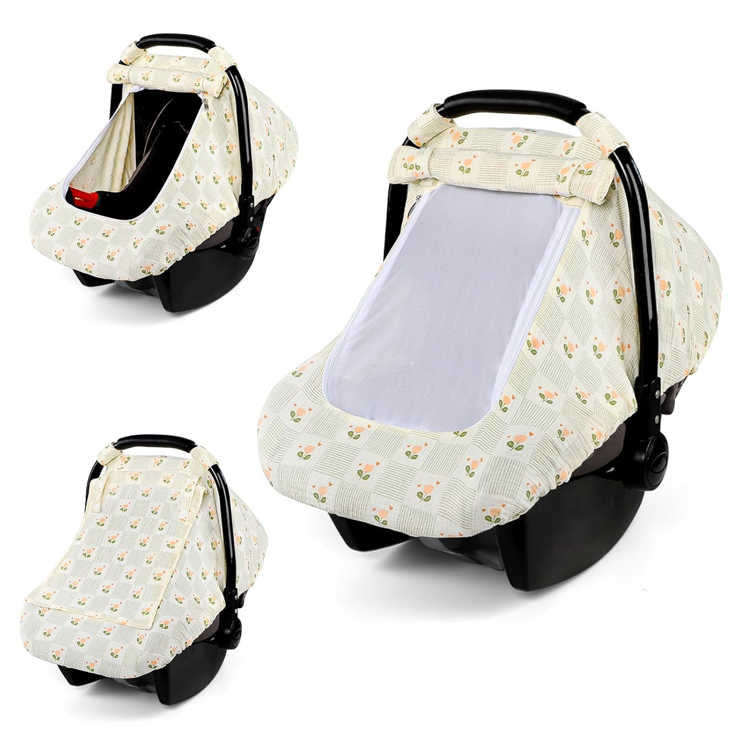 Car Seat Cover Baby, HNHUAMING Muslin Cotton Carseat Covers for Babies Girls Boys Summer Infant Car Seat Covers Canopy, Cozy Newborn Carseat Covers Stroller Cover with Breathable Mesh Window, Floral