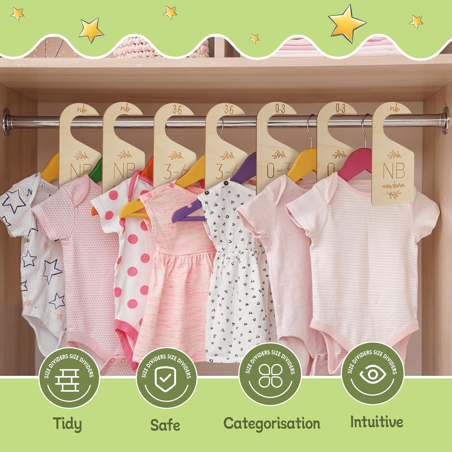 - Double-sided Design: Each baby closet divider is crafted on both sides for easy access to clothing from any angle. The baby closet dividers are made of wood and feature a green pattern and modern lettering, making them both attractive and functional