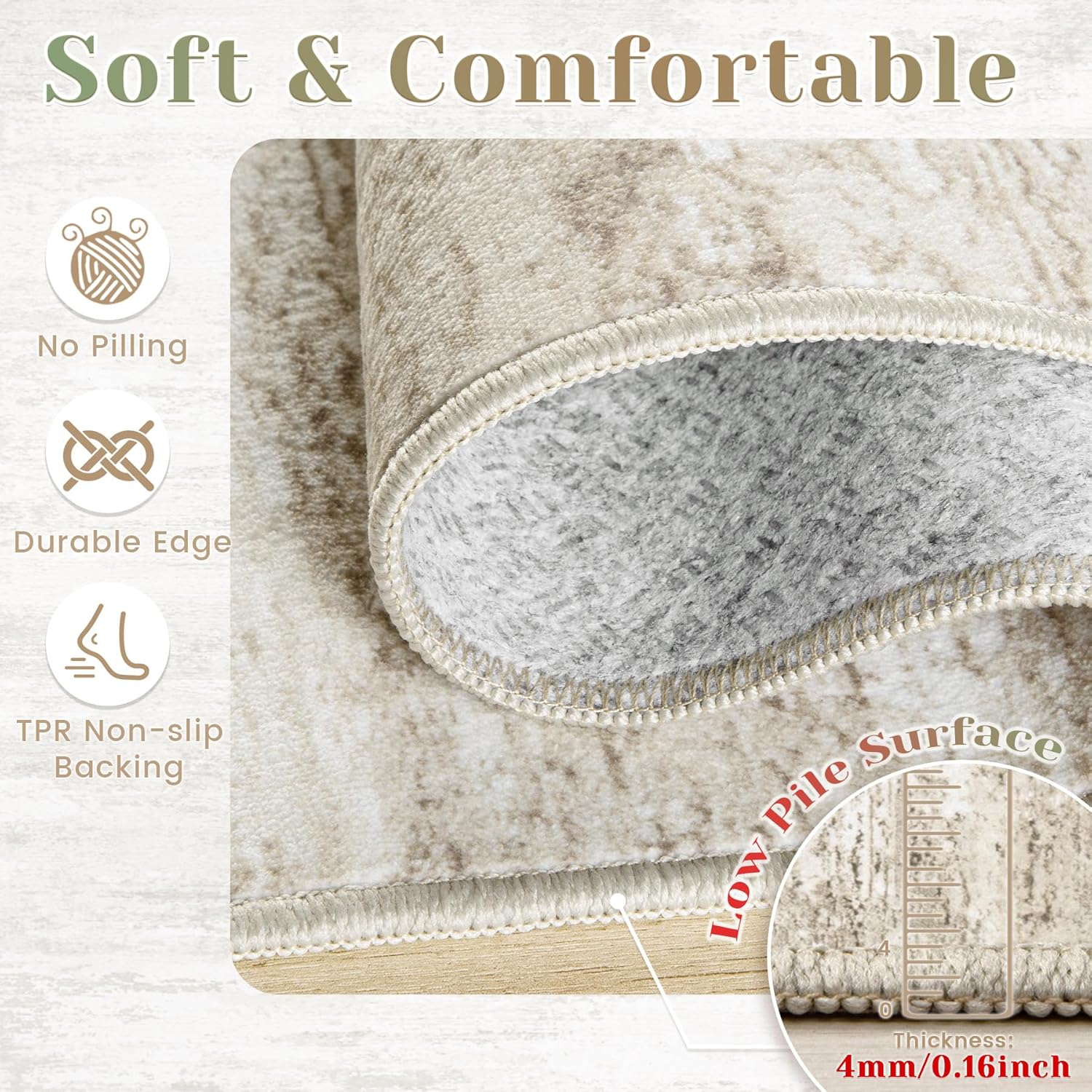 - 【Low-Profile Carpet】With a low-pile design, the washable rug 6x9 easily fits under furniture, minimizing tripping hazards. It won’t obstruct doors when opening or closing, and the robotic vacuums can also move freely to clean the neutral bedroom rugs.