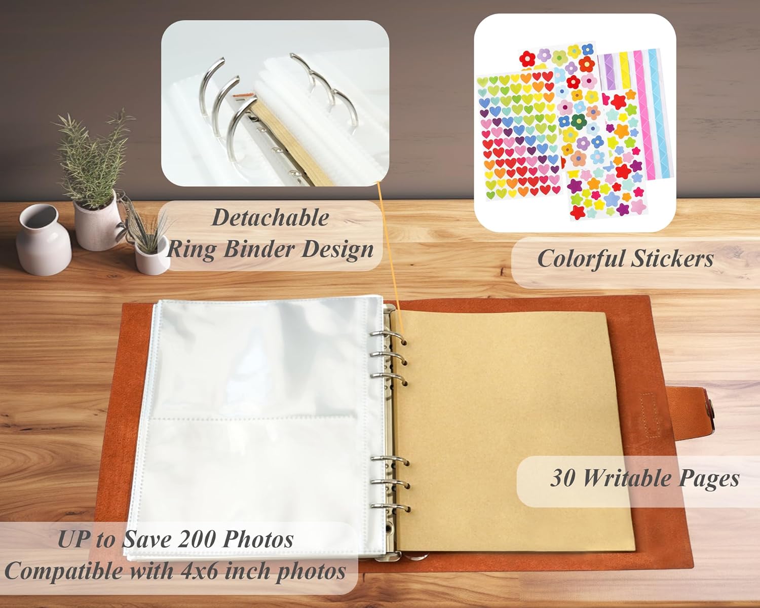 Genuine Leather Photo Album 4x6 for 200 Photos, Scrapbook with Writing Space of 30 Paper and Stickers, Travel Family Wedding Kids Graduation Ultrasound Baby Picture Album, Fathers Day Gift, Brown