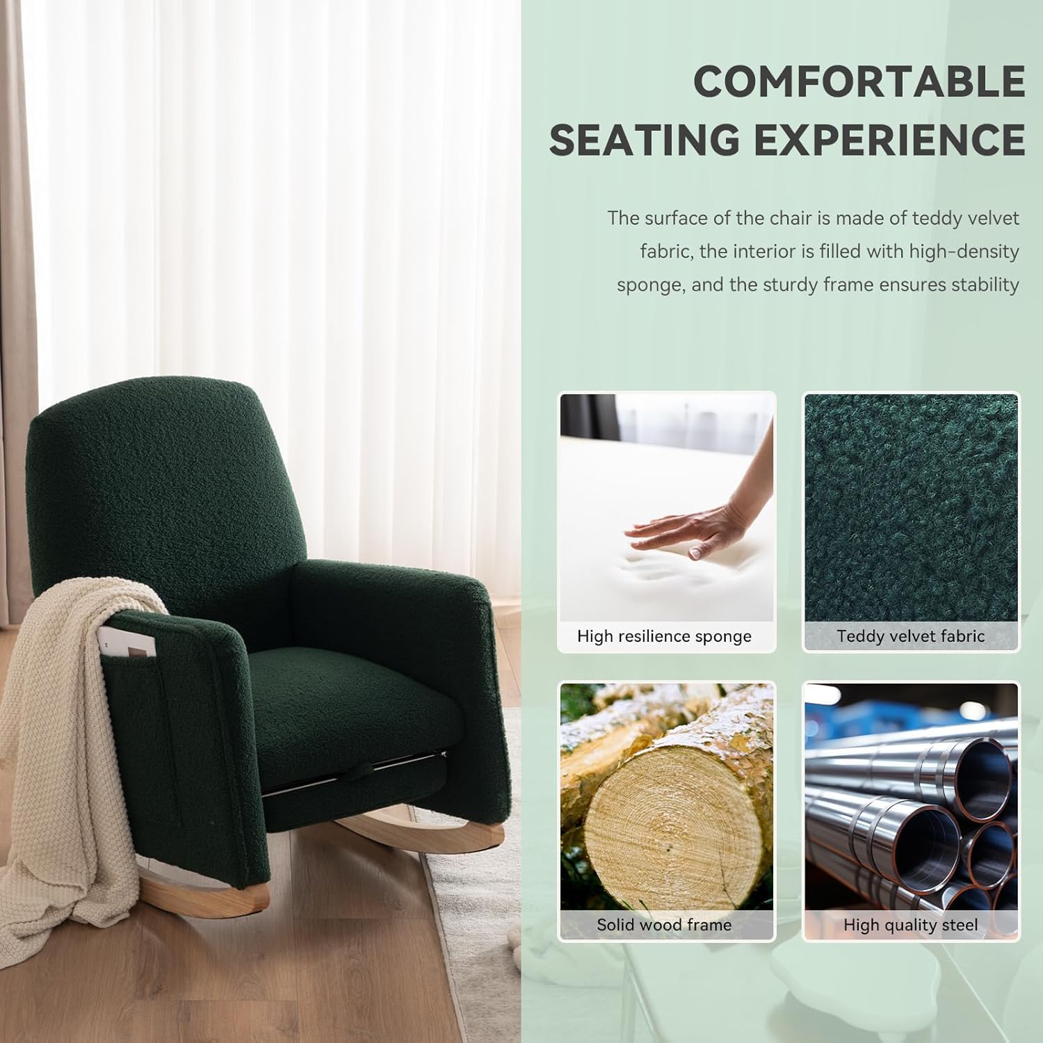 FOXHUNTER Rocking Chair Nursery with Adjustable Footrest and High Backrest, Upholstered Glider Chairs with Side Pockets for Nursery, Rocker Armchair Indoor for Living Room,Green