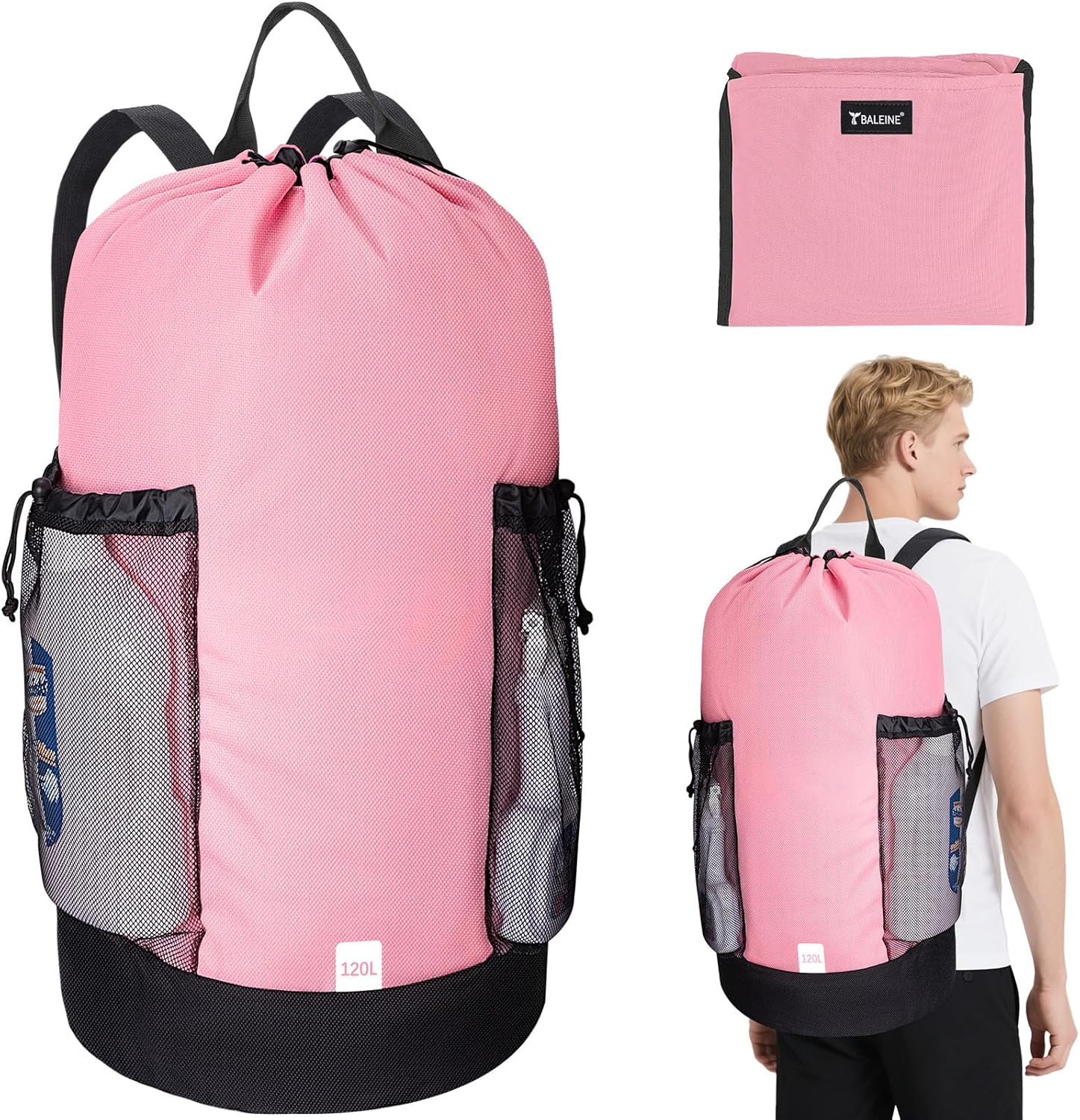 BALEINE 120L Laundry Bag Backpack, 900D Oxford Fabric Large Travel Laundry Bags with Shoulder Straps and 2 Mesh Pockets for College Dorm, Apartment, Laundromat (Pink, 120L)