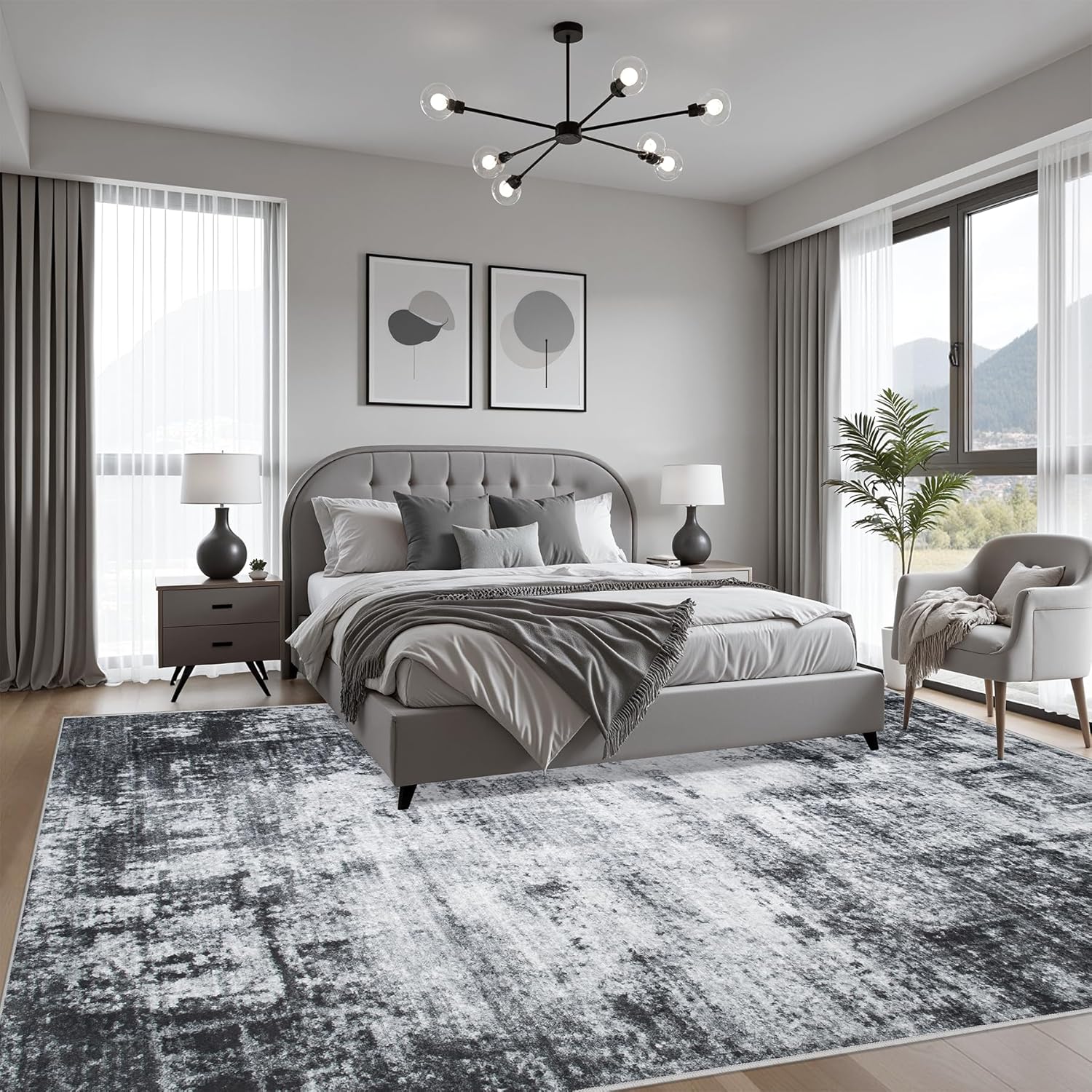 9x12 Area Rug Living Room Rug: Washable Modern Abstract Soft Thin Rug Indoor Floor No Slip Stain Resistant Carpet for Bedroom Dining Room Farmhouse Nursery Home Office - Dark Black