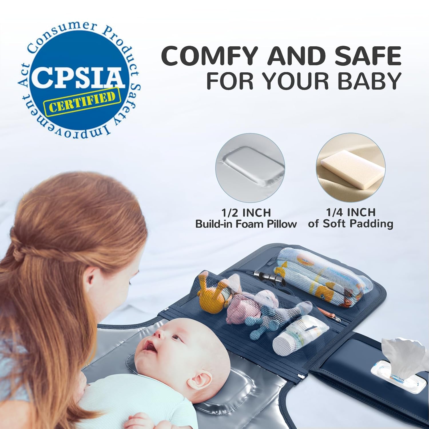 - EASY TO CLEAN AND COMFY FOR BABY. The Alatino Portable Changing Pad is made of premium materials The high-quality padded surface features a built-in ½ inch memory foam pillow to cushion your baby’s head. Also, the waterproof material surface makes it easy to clean with a quick wipe down when messes happen.