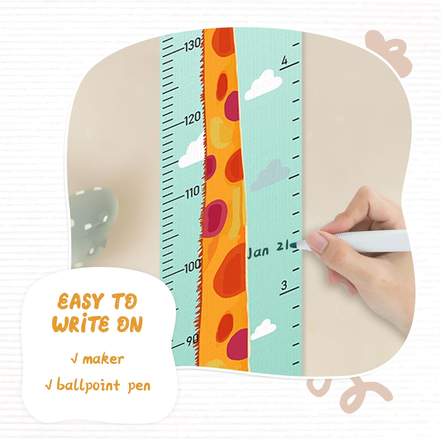 - Design: Kids growth chart with rope at the top of the chart, easy to install and removeable, foldable and portable design, easy to store, hang, roll up, transport, and save space. It boasts a material that's easy to write on, where you can use dark colored ballpoint pens and markers to track growth milestones. Our height ruler can clearly show your kids' height.