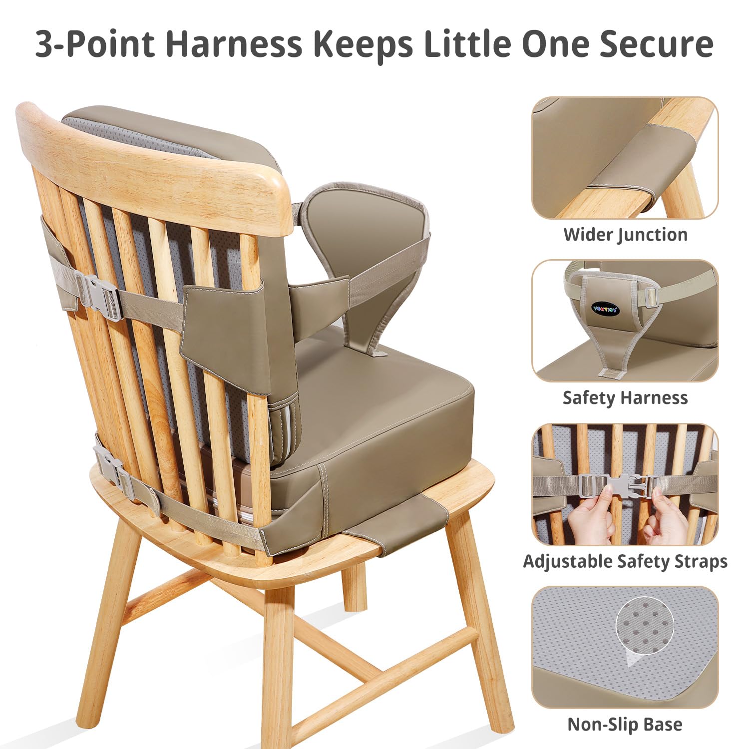 - 【Secure Design】Our YONTINY toddler booster seat for dining table adds a backrest, adjustable straps, an adjustable chair strap and non-skid base prevent slipping and sliding, providing child with a comfortable and easy mealtime!