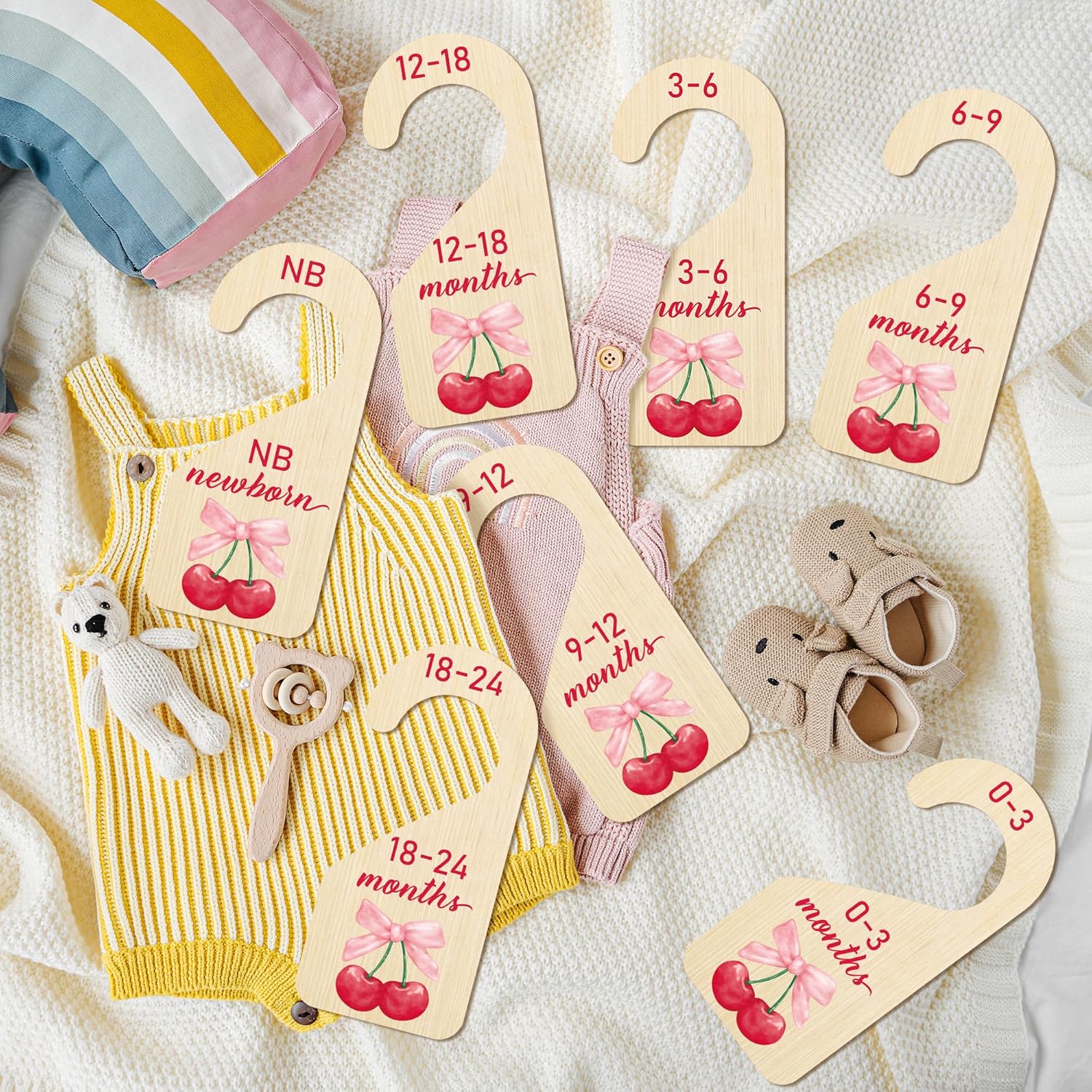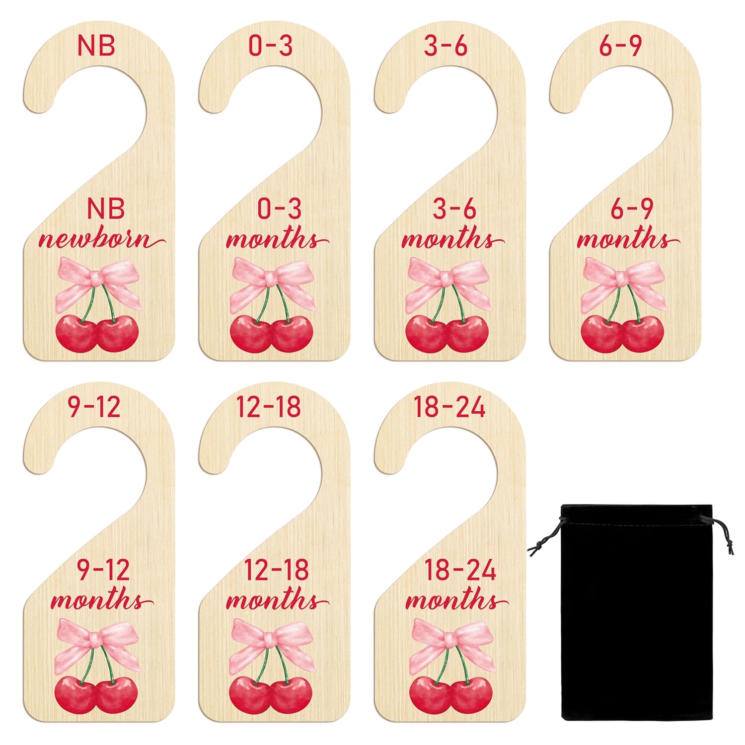 - Cherry Pink Bow Baby Closet Dividers: Package includes 7Pcs clothing dividers covering all ages from newborn to toddler, Newborn, 0-3 months, 3-6 months, 6-9 months, 9-12 months, 12-18 months, 18-24 months, and 1 black velvet bag. Great choice for organizing clothes for parents-to-be.
