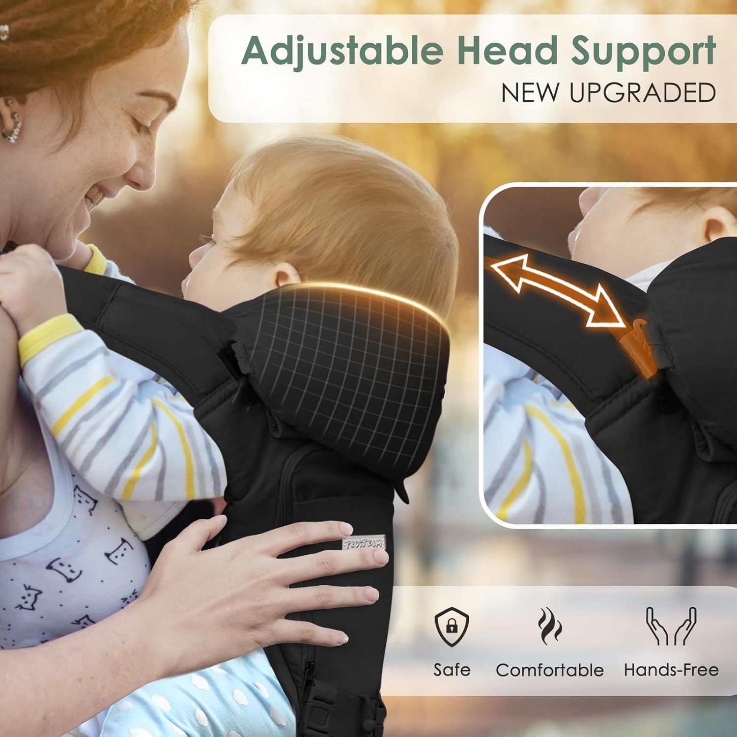 - ADJUSTABLE HEAD SUPPORT:The upgraded baby carrier features adjustable headrest to cradle newborns' delicate necks. This baby carrier newborn to toddler promotes healthy spine development for 0-36 month olds (7-45lbs).