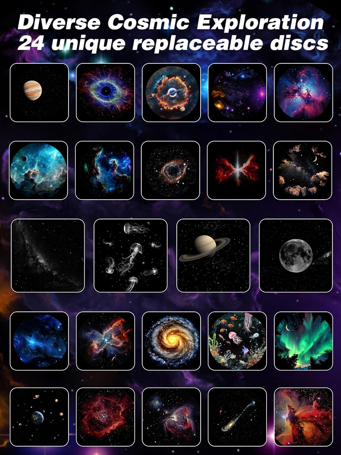 - Wide Variety of Discs: Discover a stunning collection—from constellations and starry skies to the Milky Way and planetary scenes. This projector brings the awe-inspiring beauty of space right into your room. We've thoughtfully curated a special disc set for kids to ignite their curiosity and inspire a love for exploring the universe—with even more exciting discs on the way.