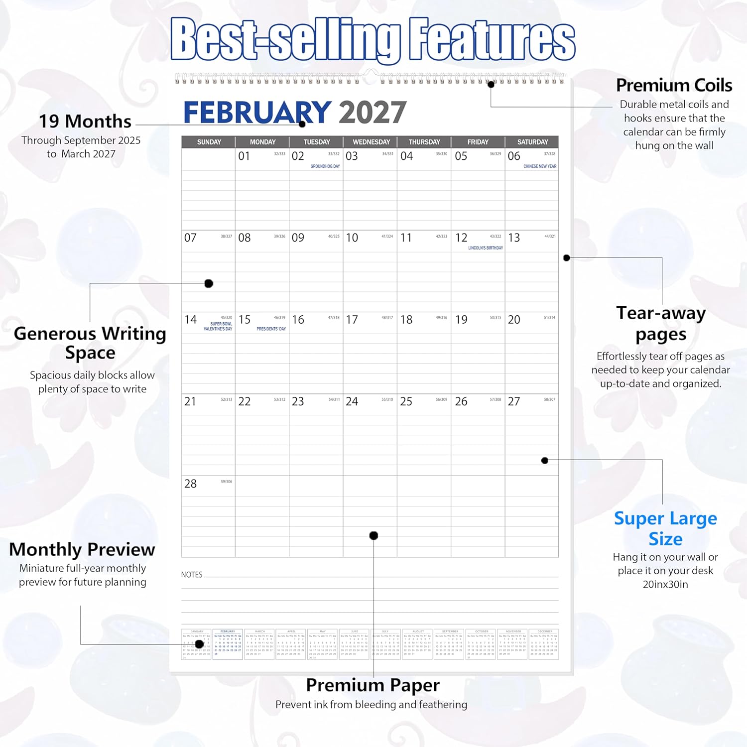 - Comprehensive Wall Calendar: Stay organized with this expansive 20" x 30" vertical wall calendar, spanning 19 months from September 2025 to March 2027. With large daily blocks, clearly marked holidays, and extra space for notes, it's an excellent planning companion for both personal and professional use