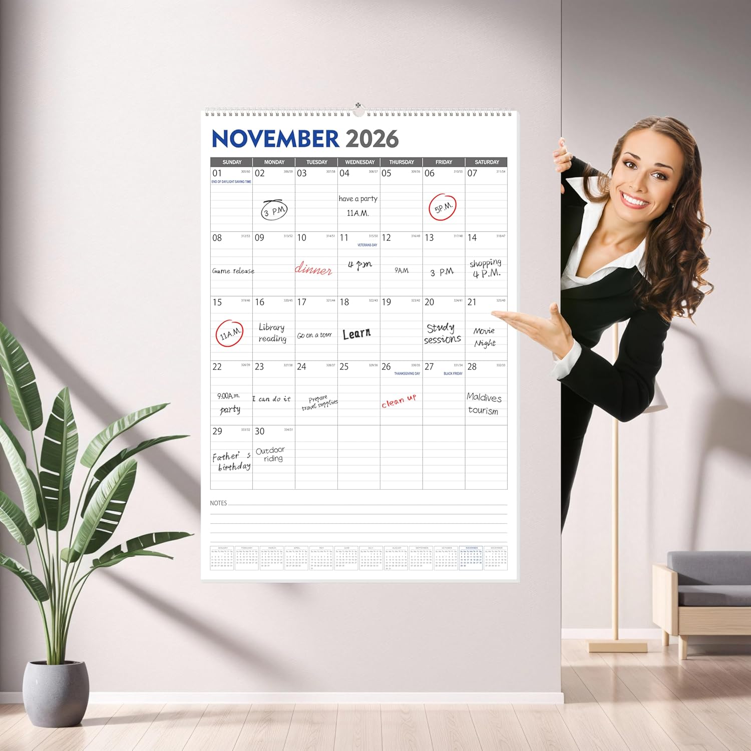- High-Quality Material: Made from thick, bleed-resistant paper, this 2026 gaint monthly calendar planner prevents ink feathering and seepage, and holds up well to regular use. Its sturdy twin-wire binding allows pages to turn smoothly while keeping the calendar securely mounted and intact throughout the year