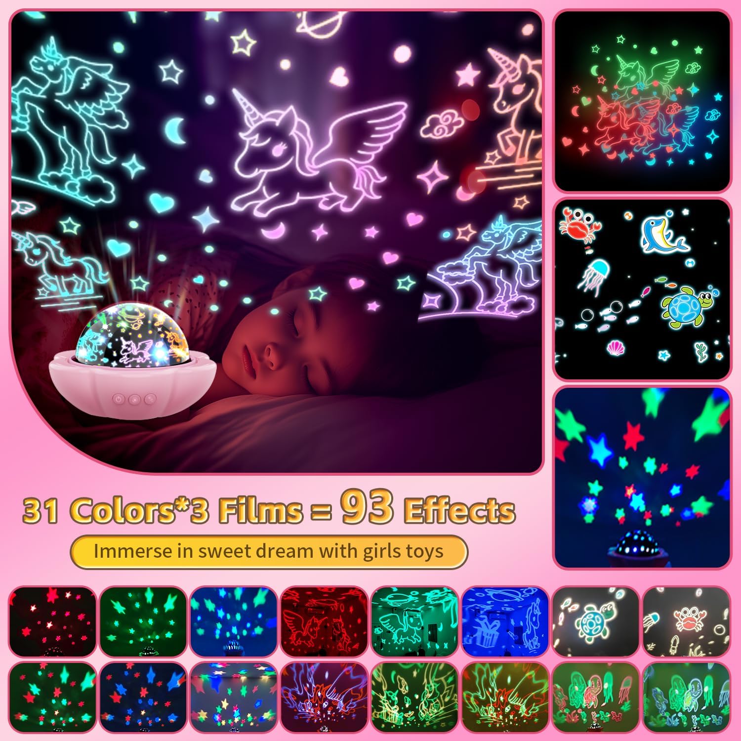 - 93 Magical Projections & 3 Films for Girls 3-10: This enchanting girls night light projects a stunning 93 colors using 3 vivid films (unicorn, star, ocean), creating a captivating projector experience. Perfect toys for 3-10 year old girls, it offers fresh patterns nightly, ensuring endless fun as toys for 3 year old girls, Gifts for 4 year old girls, christmas toys for 5 year old girls, birthday gifts for 6 year old girls, and Stocking Stuffers for Kids age 3-7.