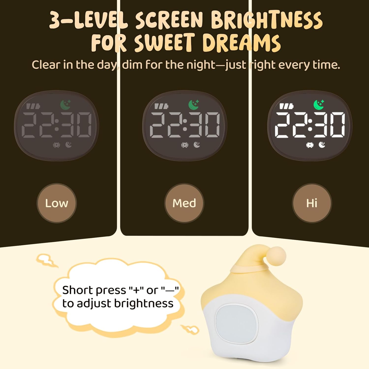 - Multi-Mode Night Light – Tap the kids alarm clock body to cycle through two brightness levels, a gradual transition mode, and a fun seven-color option. Eye-safe LED lighting creates a cozy bedtime environment while doubling as playful ambiance lighting.