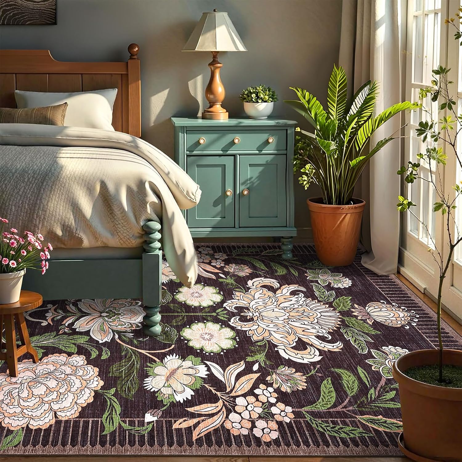 GarveeHome Plum Pink Floral Botanical Washable 5x7 Rug for Living Room, Black Purple Vintage Boho Cottage Throw Rugs Low Pile Carpet for Bedroom Dining Nursery Rug