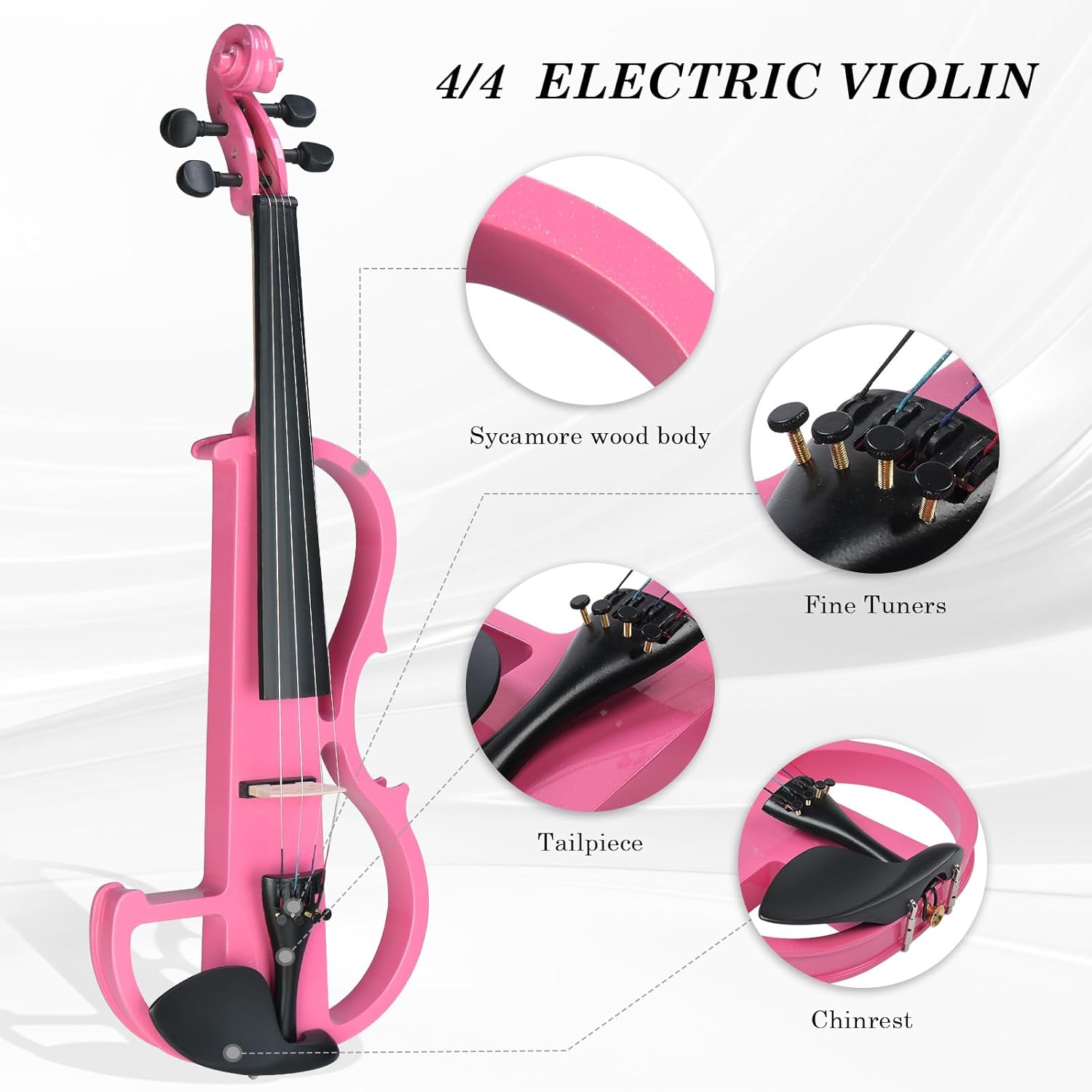Ktaxon Full Size Electric Violin, 4/4 Acoustic Silent Electric Violin for Beginner Adults Teens with Ebony Fittings, Case, Bow, Headphone, Rosin and Extra String (Pink)