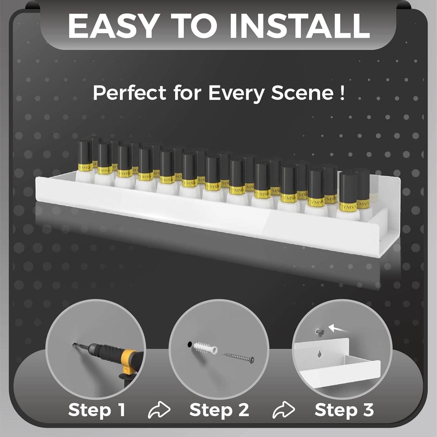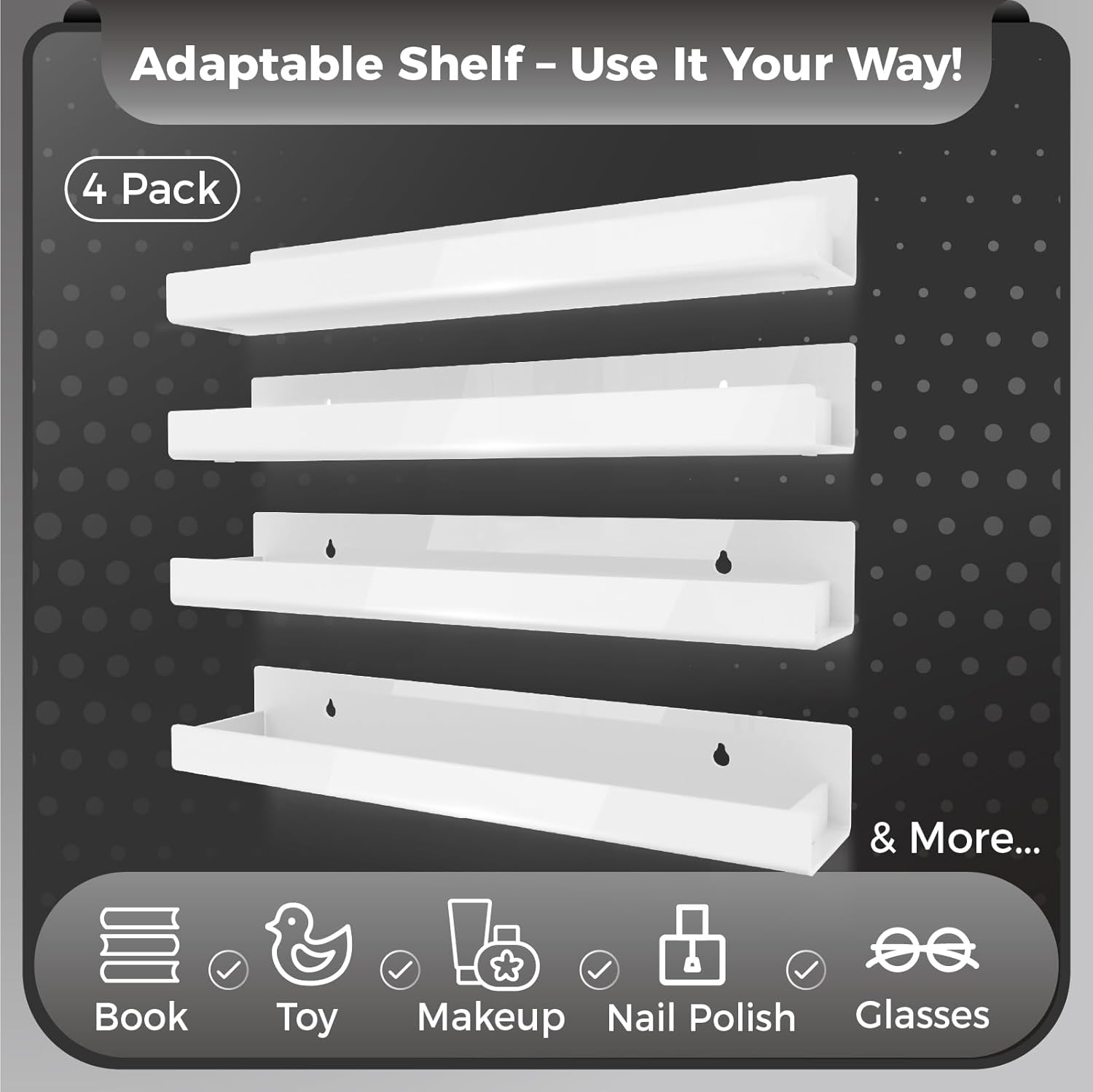 4 Pack 15 Inch Whtie Acrylic Shelves, Kids Floating Bookshelf for Kids Room, Modern Nail Polish Rack Sunglasses Essential Oil Picture Ledge Display Toy Storage Wall Shelf