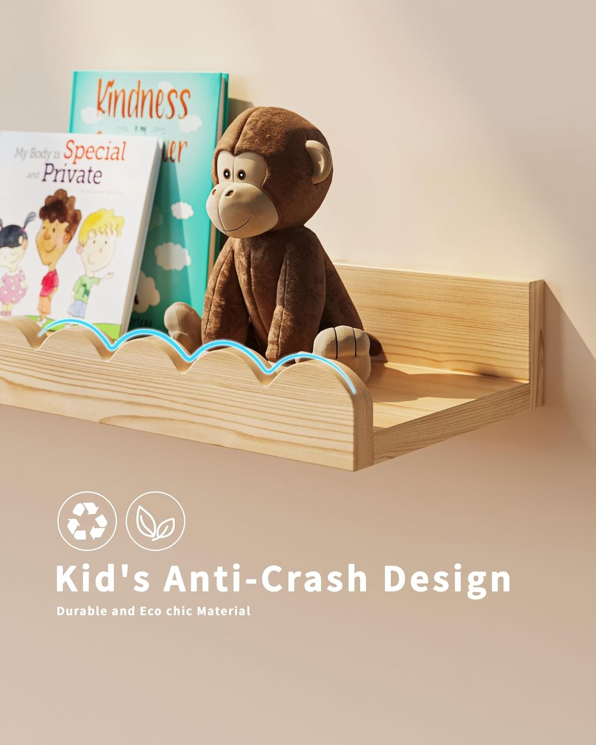 Nursery Book Shelves, 4-Pack Wood Floating Shelves for Wall Kids, Scalloped Shelves, Wall Book Shelves for Bedroom Kids, Toddler Room, Baby Room, Nursery Decor(Wood, 36 Inches)