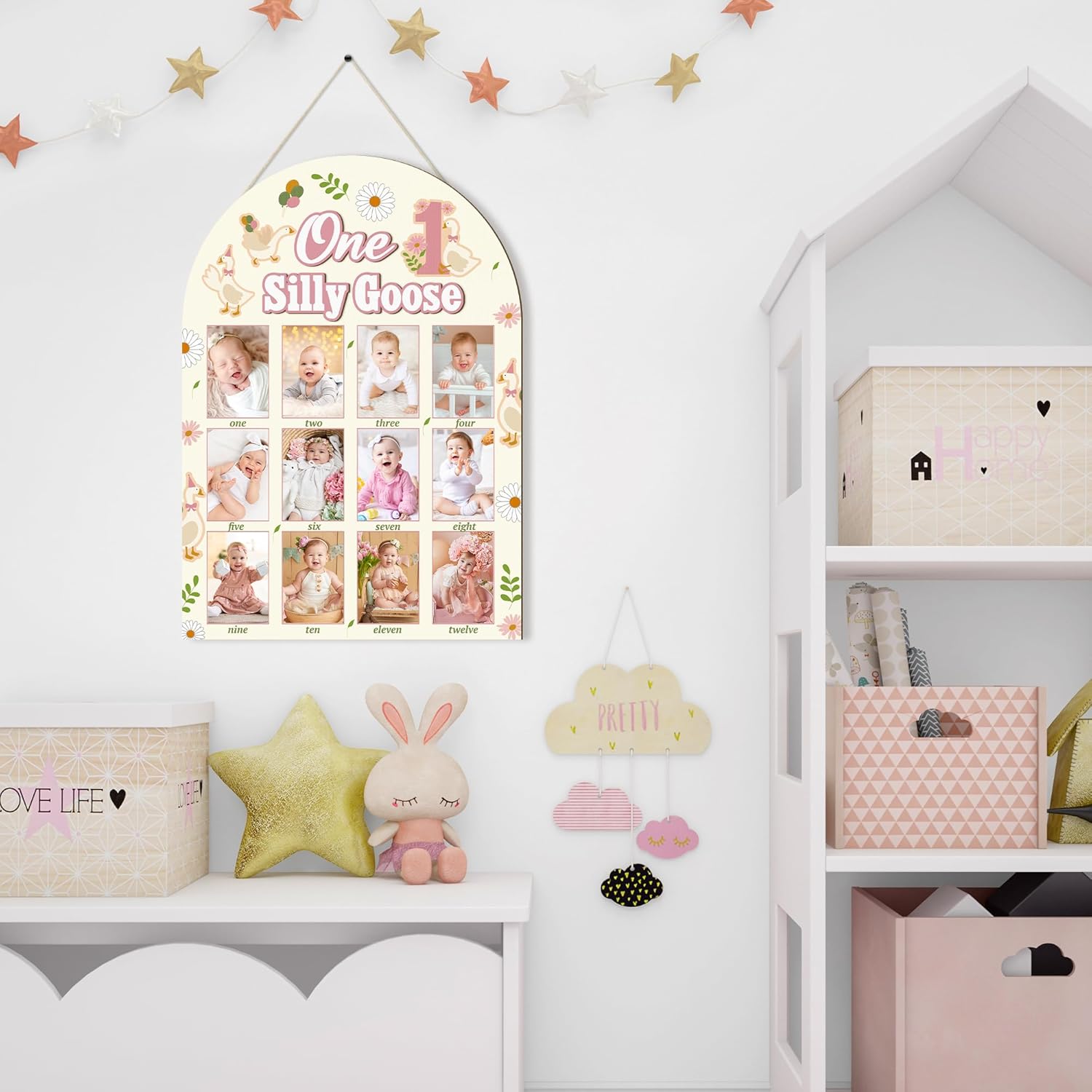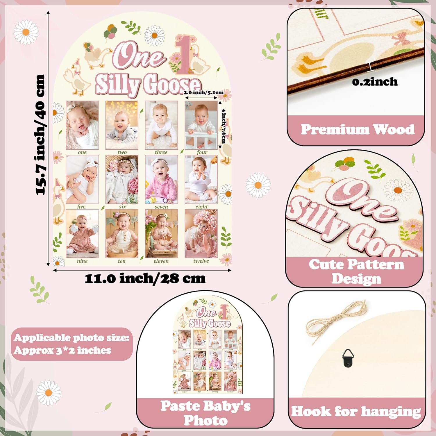 - Goose Display Wood Board: Our 1st Birthday Frame comes with hanging hooks and adhesive points, making it easy for you to mount and decorate. Crafted from durable, premium wood, it's designed for longevity. Adorned with your baby's photo, this goose-themed frame will undoubtedly become a stunning focal point at your child's first birthday celebration.