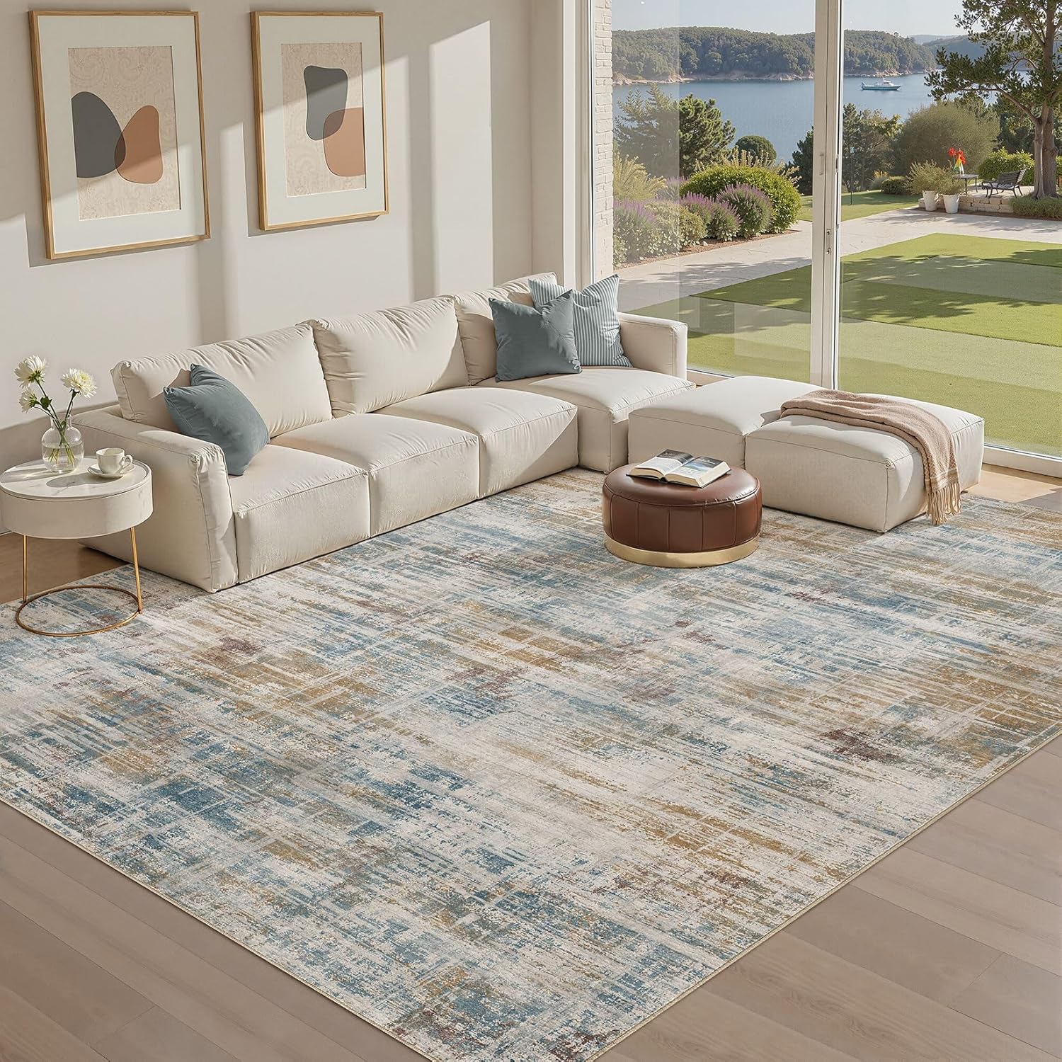 Area Rug for Living Room: 10x12 Washable Neutral Abstract Modern Soft Rugs Non Slip Indoor Floor Stain Resistant Large Carpet for Bedroom Dining Room Office Nursery - Blue Brown