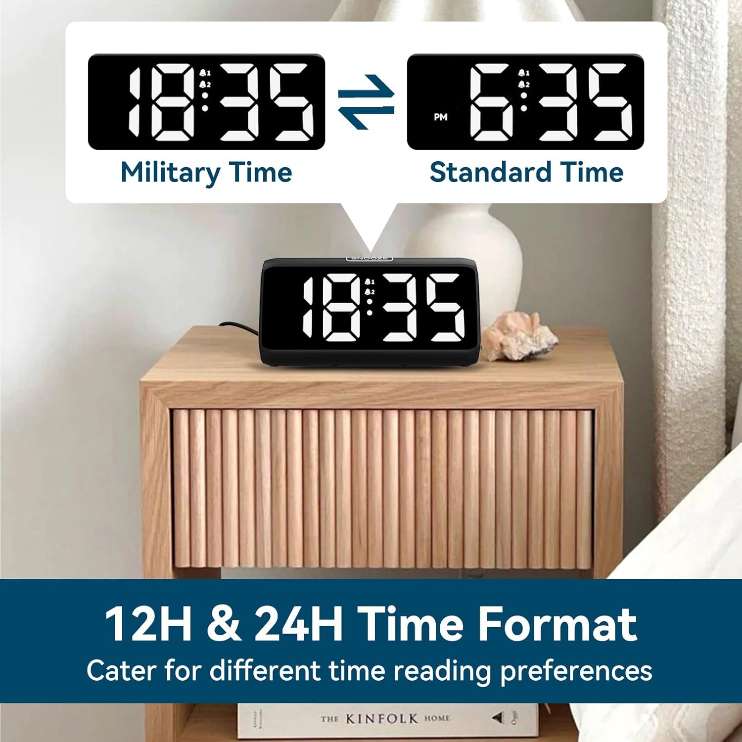 - DUAL ALARM CLOCK WITH SNOOZE FUNCTION: Our bedside alarm clock supports setting two separate wake up times, convenient for family members with different schedules. There is an easily accessible snooze button on the top, enabling you to easily activate an additional 9 minutes of snooze even in a half-awake state.