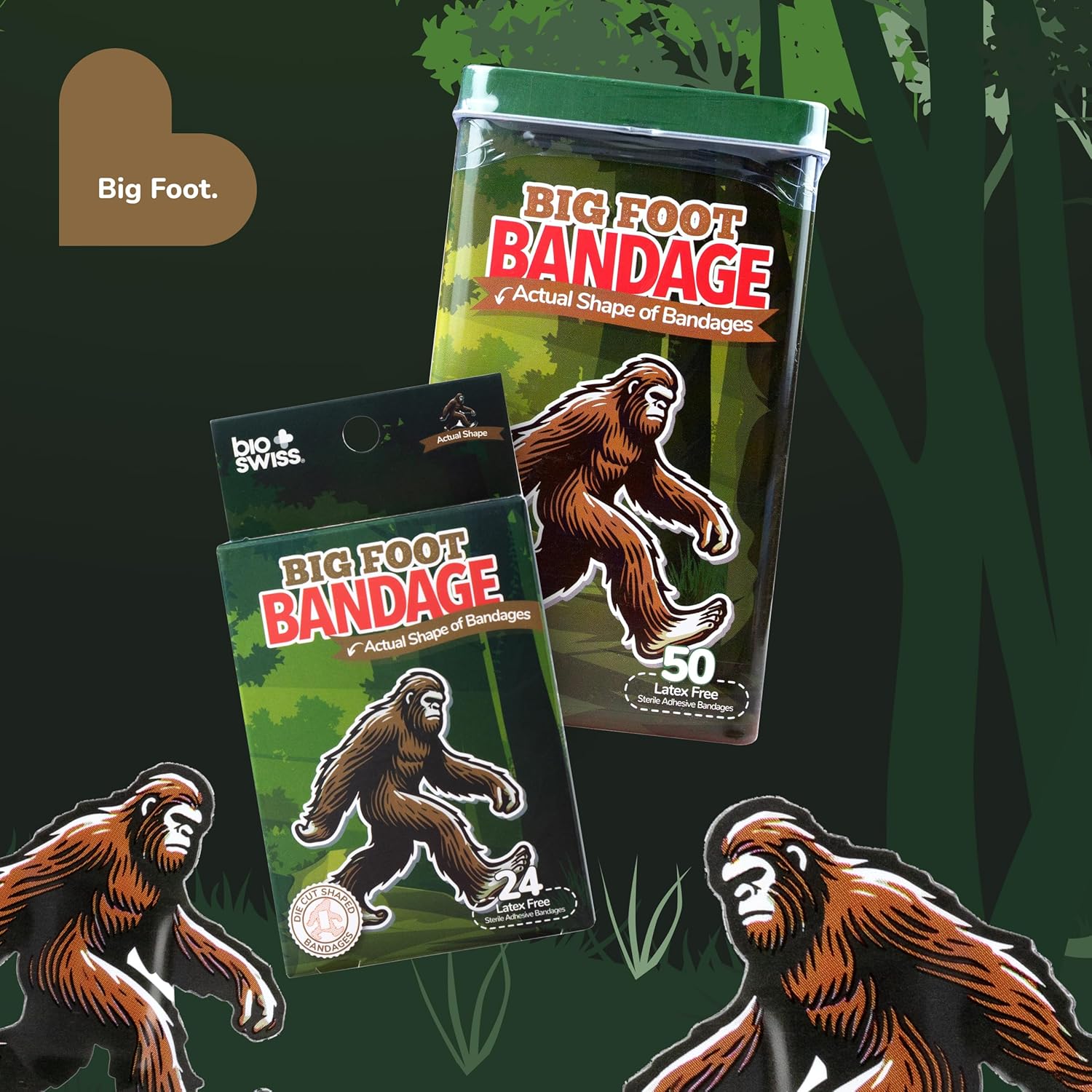 - BIGFOOT BANDAGES: This 24 piece pack of Sasquatch shaped bandages is great for putting a smile on kids' faces while protecting wounds such as cuts, scrapes, and burns; sticky bandages come in a cute tin and are perfect for kids and adults alike, and also for school nurses and pediatric doctors