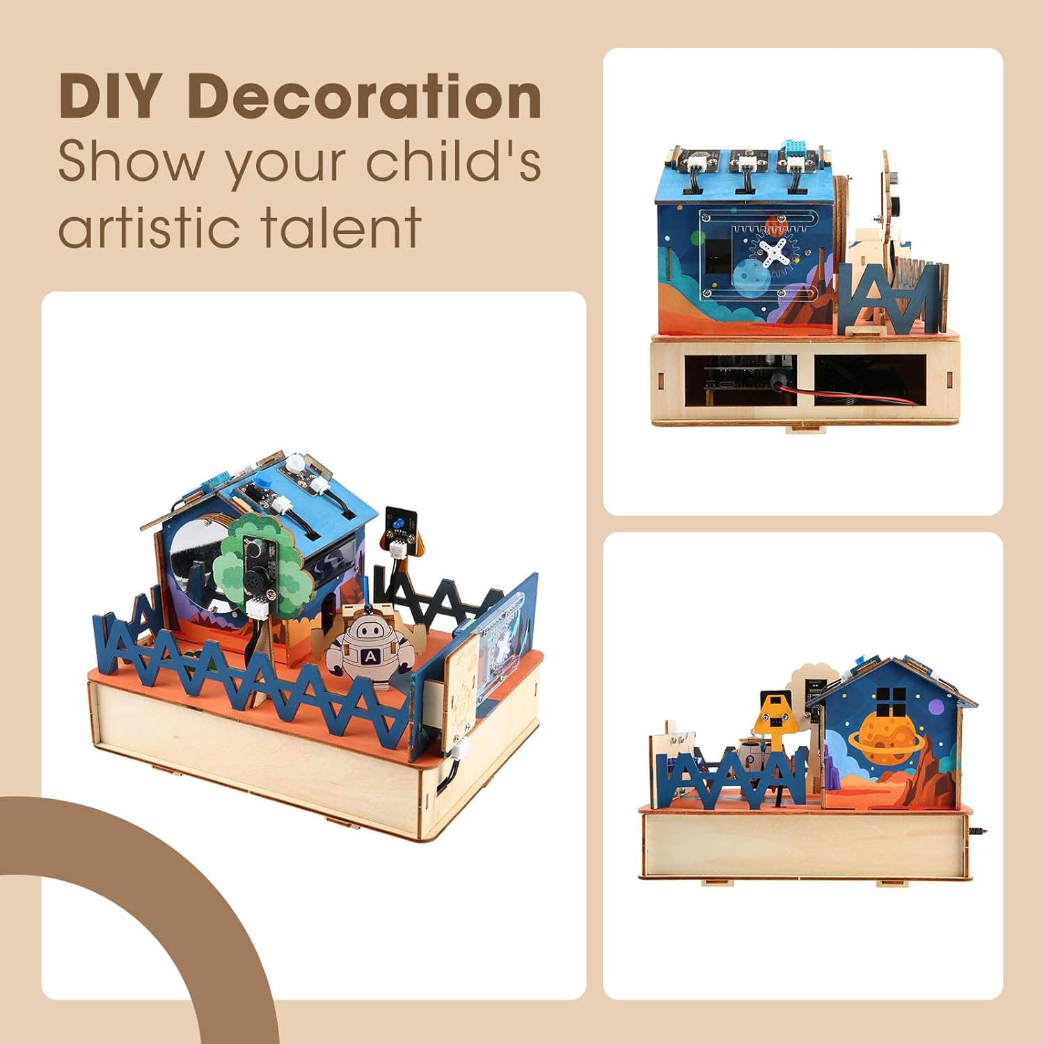- Safe and eco-friendly wooden house design.Built with laser-cut, eco-friendly plywood, this building set for boys age 12+ promotes safe, hands-on creativity with zero soldering or screen dependency. The DIY smart home can be painted and customized, making every build unique. A perfect blend of technology and imagination, this project adds creative depth to classic STEM toys and appeals to both boys and girls who enjoy physical crafts and coding.(Note: Battery required, not included.)