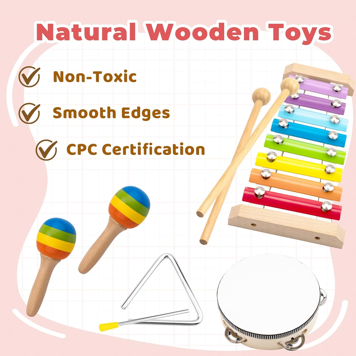 - Durable and Safe Baby Wooden Toys: Baby instruments made from natural wood with non-toxic, child-safe water-based paint. Smooth, rounded edges.Strong construction handles enthusiastic play.Compare with others,This colourful music toy for toddlers and preschool children promotes colour and shape recognition