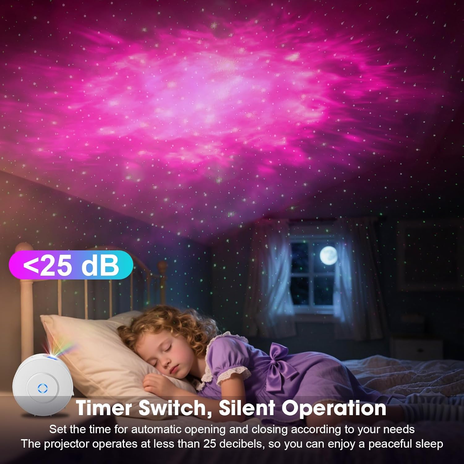 - 【 Noise Reduction Technology 】Using the latest noise reduction technology, which can create a relaxing andpleasant atmosphere for you and let your family enjoy a comfortable sleep. You can easily use the "Smart Life" appto control the swritch, color and brightness of the LED projector, and even turn this night light projector on and off ata specific time without disturbing your children.