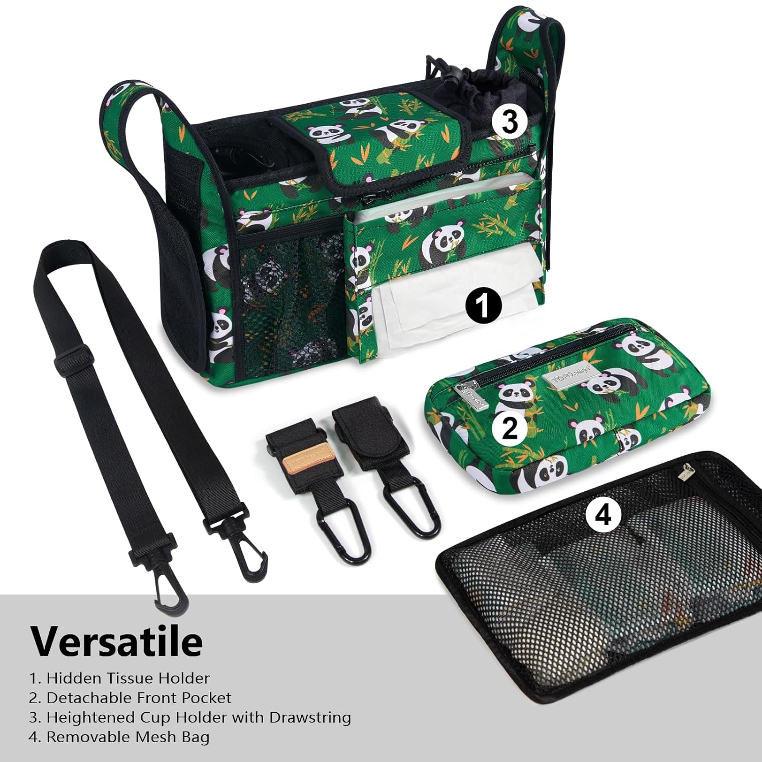TOPDesign Universal Baby Stroller Organizer, Stroller Caddy with Detachable Mesh Bag & Heightened Insulated Cup Holders & Non-Slip Secure Hooks Accessories, Fits Most Strollers (Pandas)