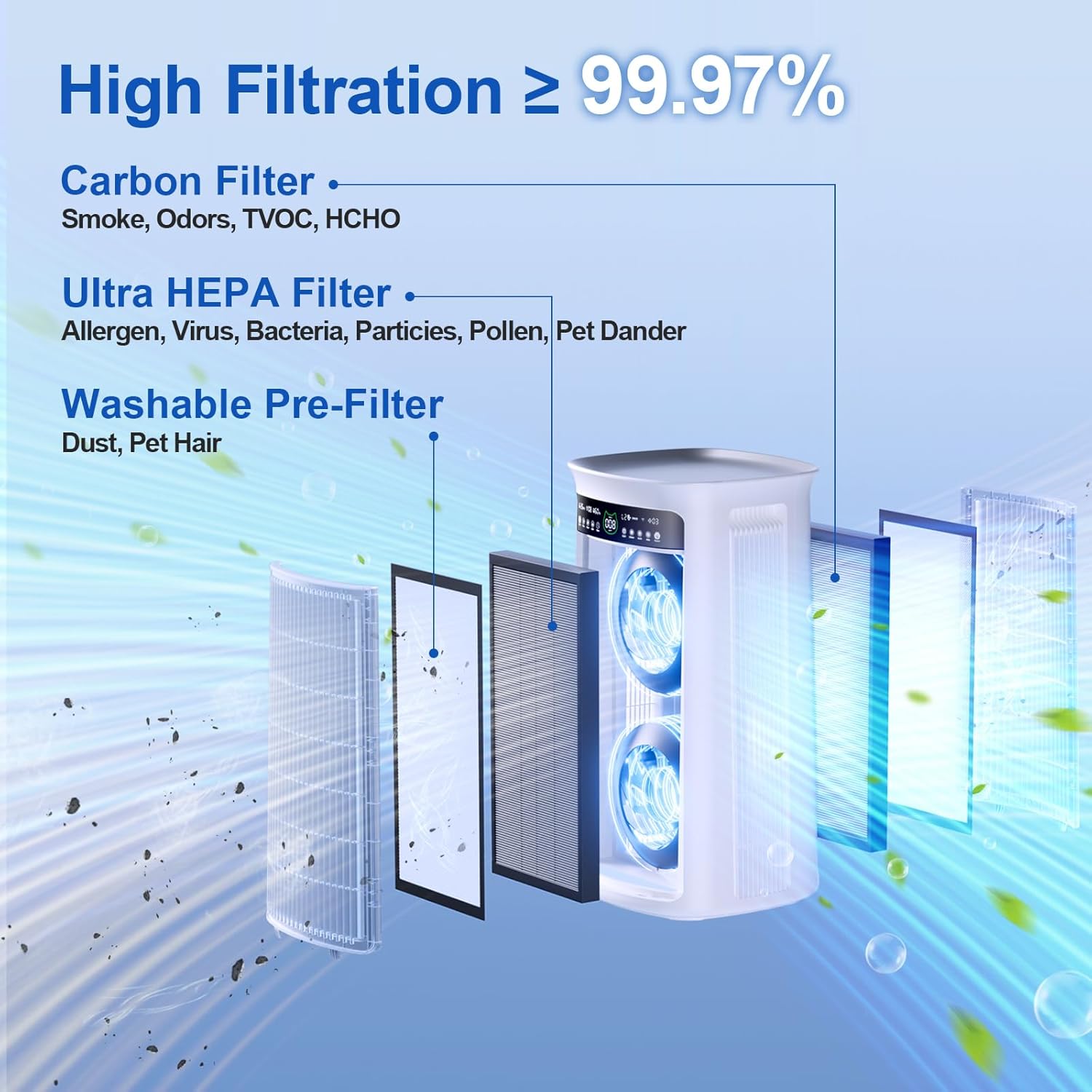 - Medical-Grade Filtration for Allergies & Asthma: SoleusAir air purifier is equipped with four layers of air filters, which can effectively intercept and adsorb particles as small as 0.25μm. The removal rate of harmful substances is as high as 99.97%.It providing scientific filtration and building an invisible protective barrier for sensitive individuals. Auto Mode adjusts fan speed based on real-time air quality.