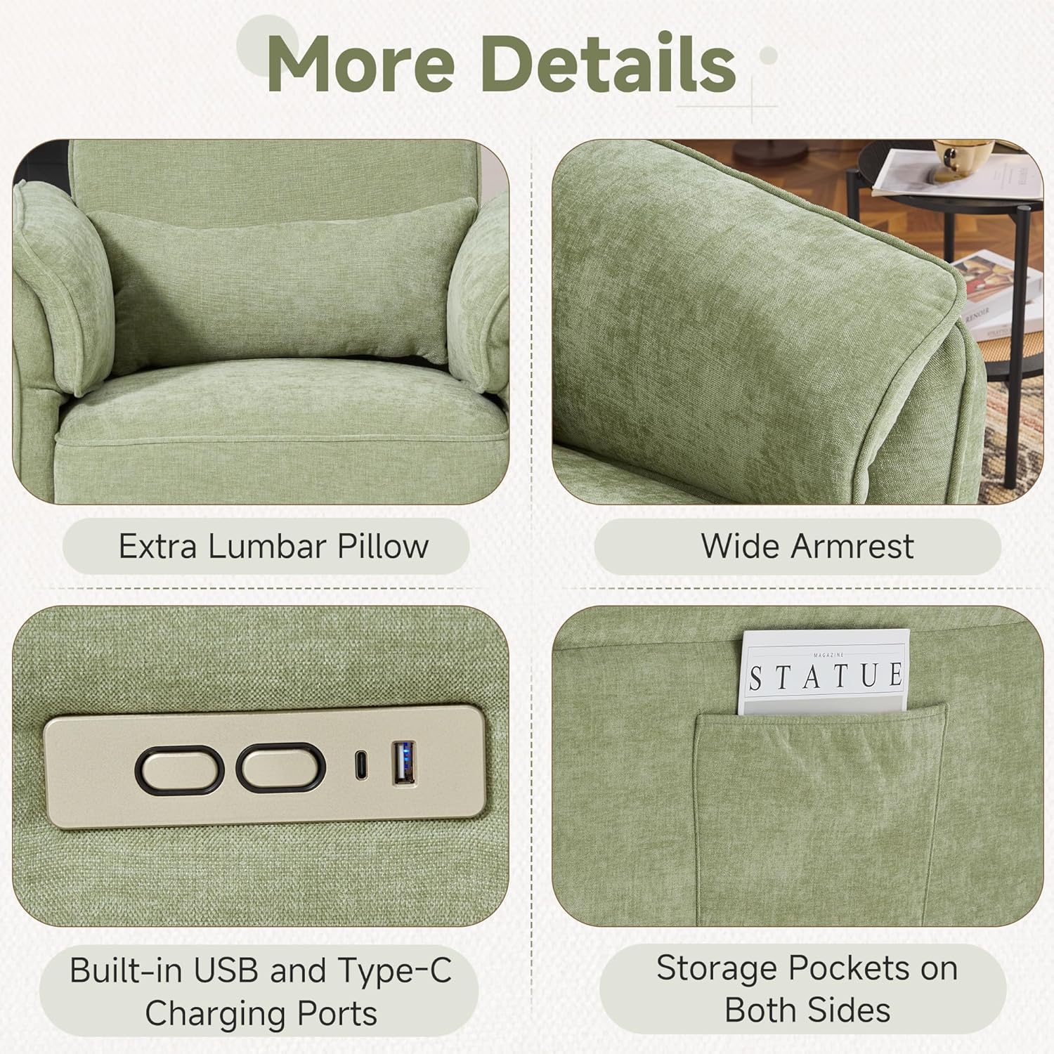- [Convenience Design] This nursing chair has built-in USB and Type-C charging ports, making it easy to charge your mobile devices, staying connected while caring for your baby. Plus, convenient side pockets keep books, magazines, and baby essentials within easy reach.