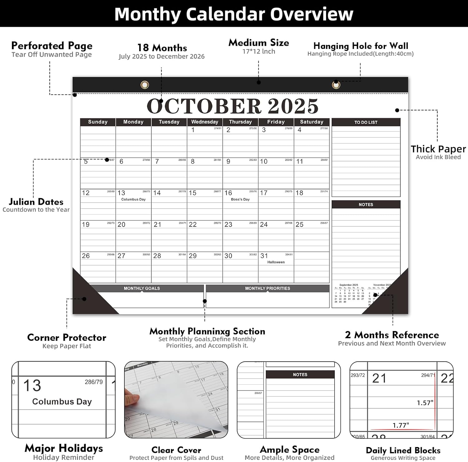 - 2 IN 1 Desk Calendar & Wall Calendar 2025-2026:Tcamp 2025-2026 desk calendar (17"x12") offers spacious layout for monthly/daily scheduling & tracking. With clearly labeled holidays and dates, it helps you track appointments, meetings, deadlines easily. Desk planner runs from July 2025 to December 2026, perfect for multi-phase projects, course schedules, and work plans.