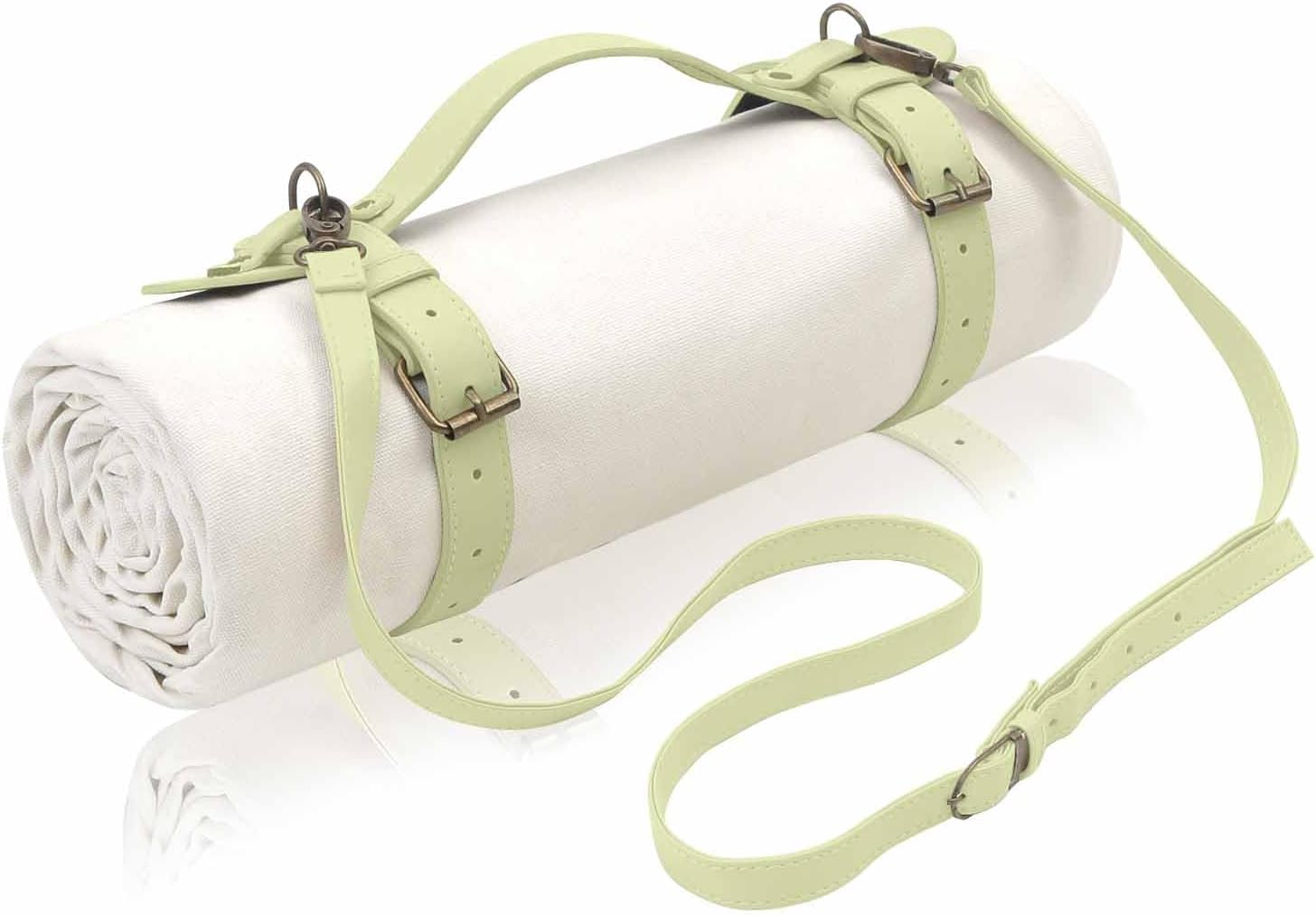 - Includes: 1 white canvas mat, faux leather handle/should strap, and webbing strap
