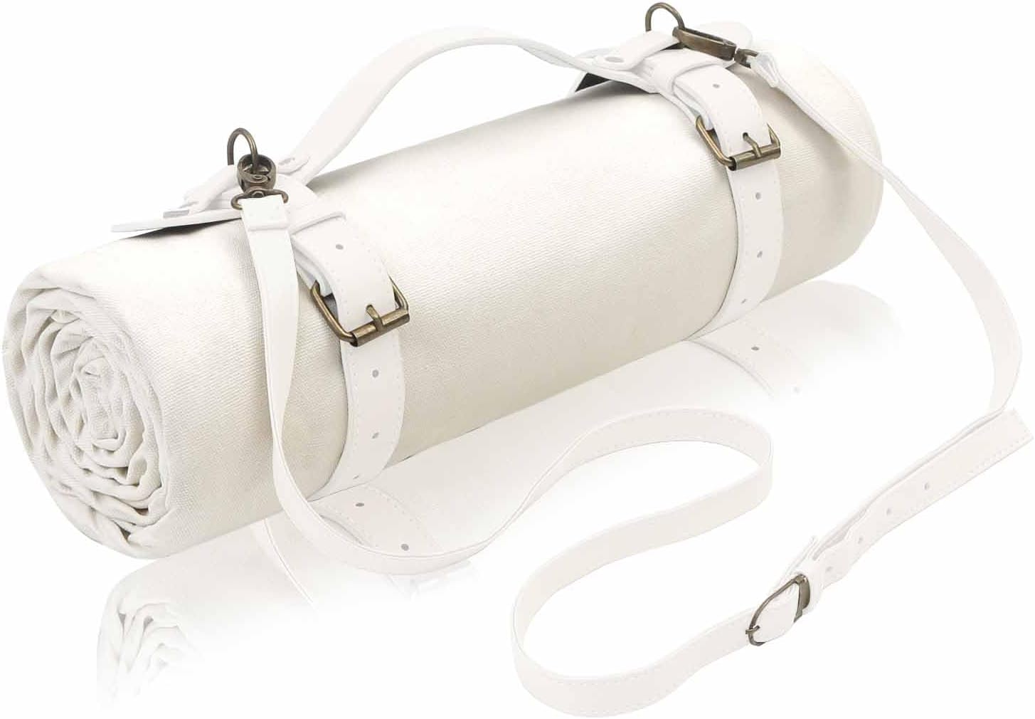 - Includes: 1 white canvas mat, faux leather handle/should strap, and webbing strap