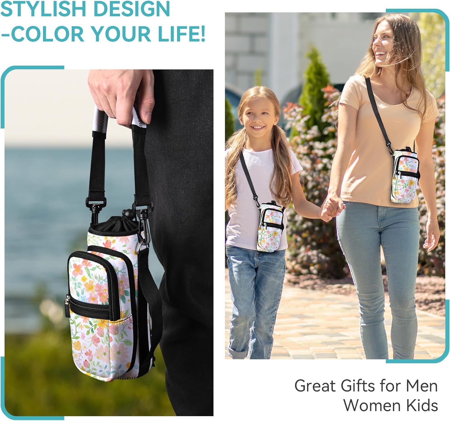 • GREAT FOR TEENS & ADULTS: Both adults and Kids can find great use in this AUPET water bottle carrier holder. Use it for walking,running,gym,cycling,hiking and more.with two zipper pockets for smartphone,cash,card keys and other small items.with the adjustable shoulder strap and the carring strap,it will fits all body types,you can wear over the shoulder, cross chest as a sling bag or just hand carring.<br/>