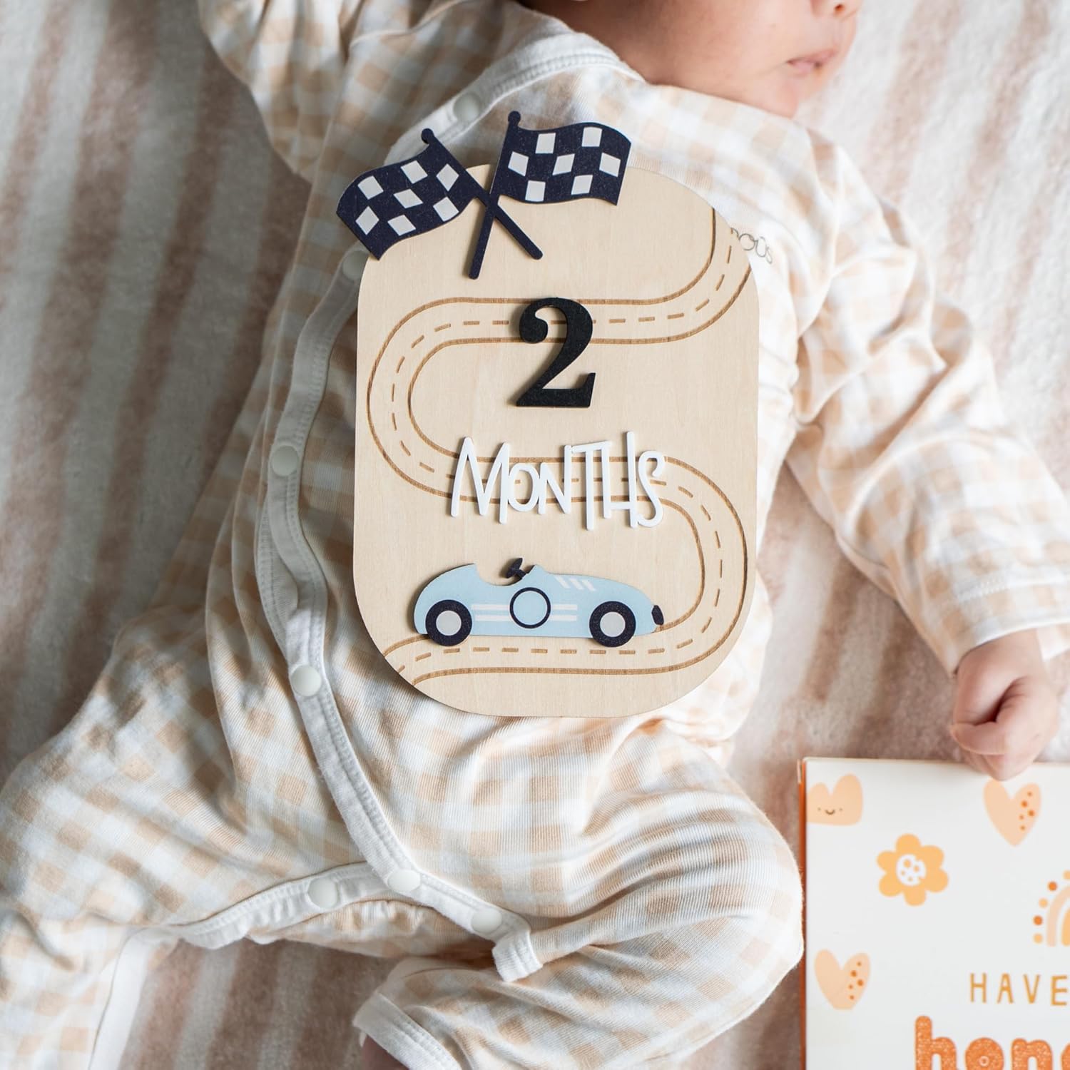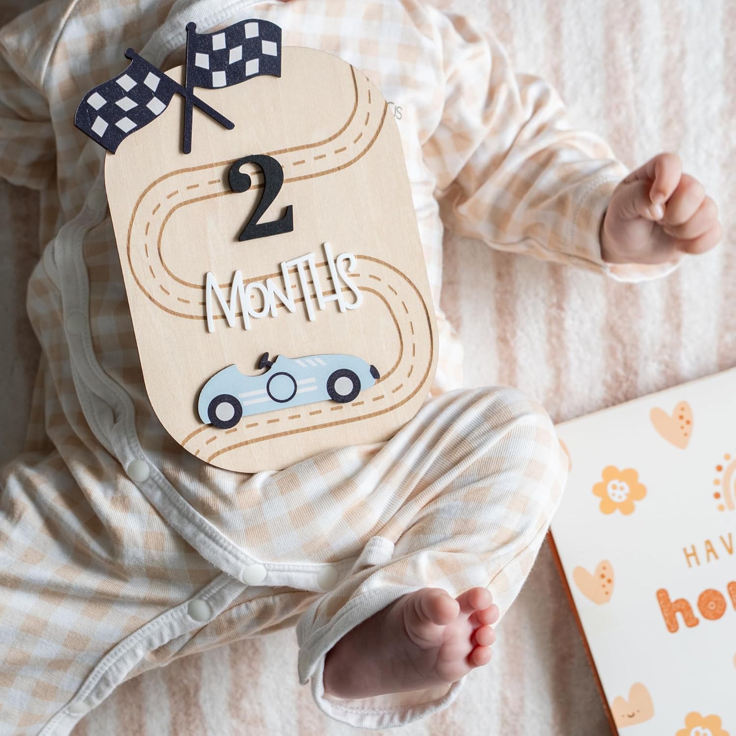 - 🏁 Designed for Baby Boys – With checkered flags and a vintage car design, these month milestone baby boy signs are tailor-made to document your little racer’s first year in style.