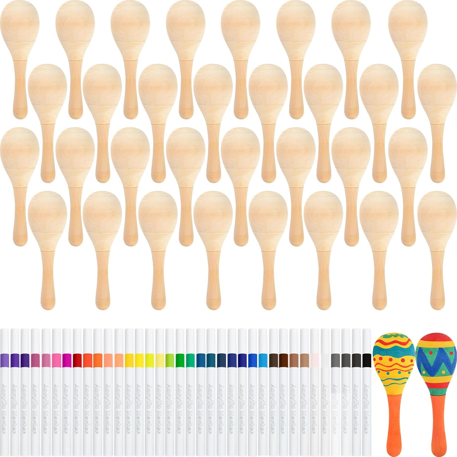 NEBURORA 12Pcs DIY Mini Unfinished Wooden Maracas with 12Pcs Multicolor Pens Fiesta Mexican Maracas Favors Cinco De Mayo Party Supplies Decorations