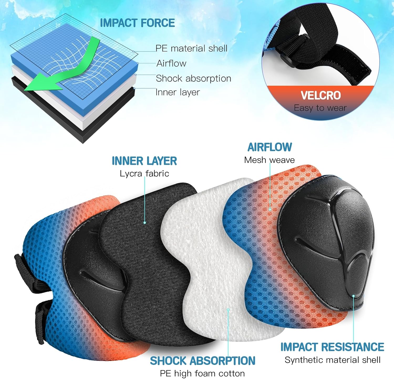 - 【HIGH-QUALITY PROTECTION】The toddler skateboard helmet set made of a sturdy PC shell and high-density shock-absorbing EPS foam. There are 8 vents on the top to keep your child's head cool and comfortable. The outer shell of the knee pads and elbow pads is made of PE material and filled with soft EVA foam to effectively cushion the impact.