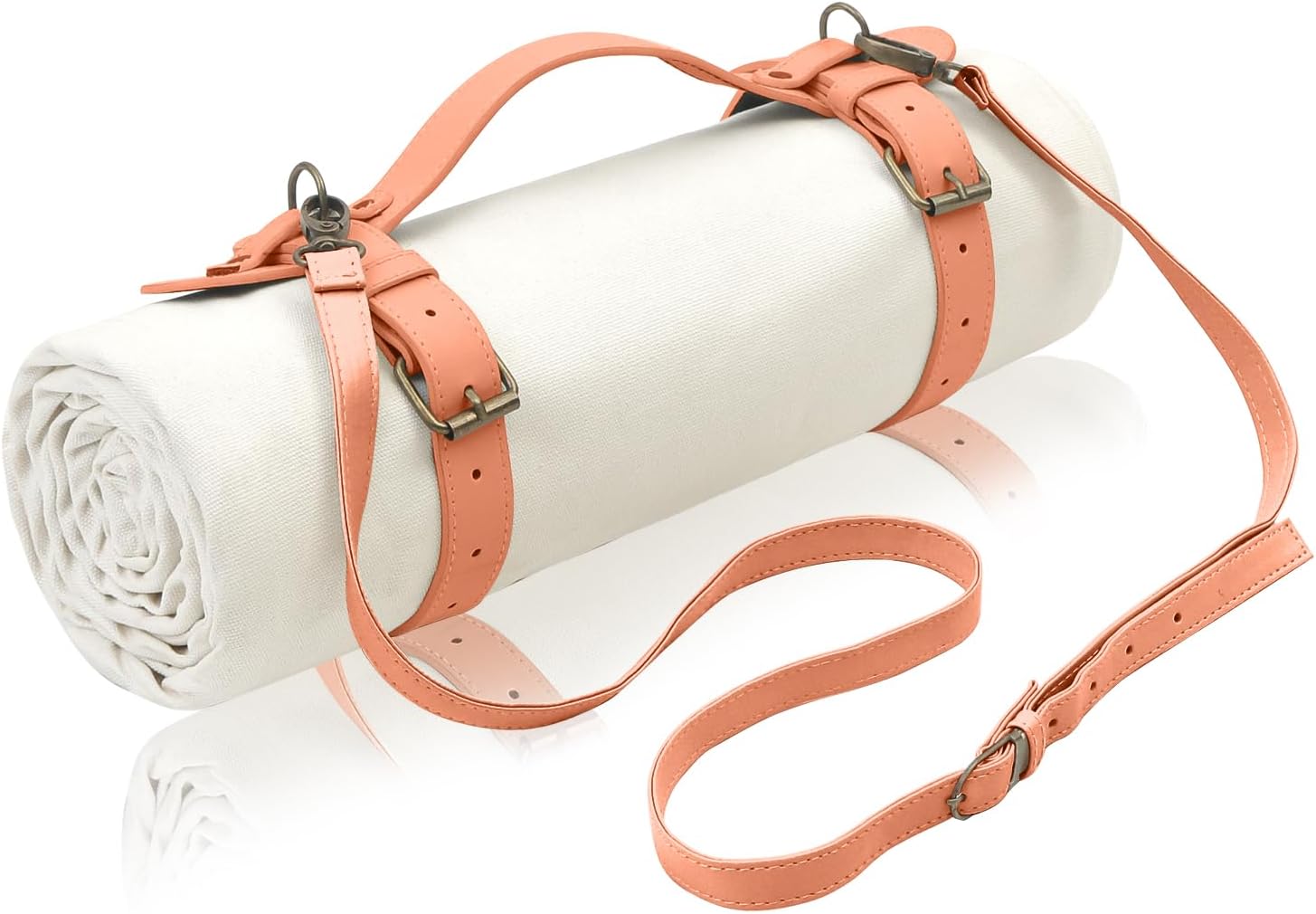 - Includes: 1 white canvas mat, faux leather handle/should strap, and webbing strap